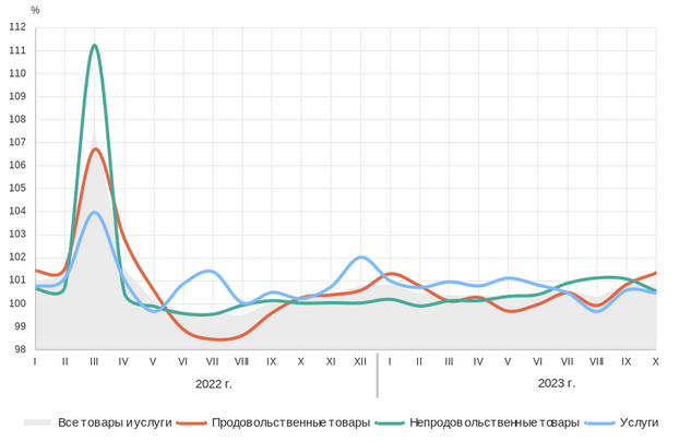 | непродовольственные товары | 100,55 | 104,96 | 105,08 | 103,83 | 100,04 | 112,57 | 114,10 | 115,66 |