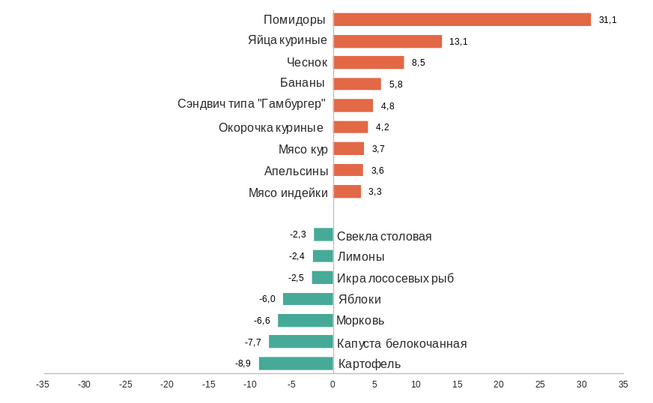Увеличение цен отмечалось на отдельные виды плодоовощной продукции, в том числе на помидоры - на 31,1%, чеснок - на 8,5%, бананы - на 5,8%, апельсины - на 3,6%, виноград - на 2,1%. В то же время цены на картофель снизились на 8,9%, капусту белокочанную - на 7,7%, морковь - на 6,6%, яблоки - на 6,0%, лимоны - на 2,4%, свеклу столовую - на 2,3%.