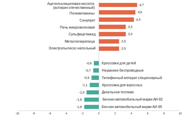 При этом снизились цены: на кроссовки для взрослых и детей - на 1,1% и 0,6% соответственно, телефонные аппараты стационарные - на 0,9%, наушники беспроводные - на 0,7%, компьютеры планшетные, велосипеды дорожные для взрослых, зонты, сумки женские, ранцы, рюкзаки для школьников, бумагу офисную, бумажные носовые платки, отдельные виды одежды и обуви - на 0,1-0,4%.