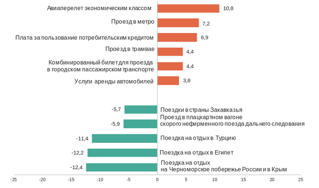 Среди прочих услуг туризма и отдыха выросла стоимость: автобусных экскурсий - на 1,9%, билетов в театры - на 0,9%, экскурсионных туров по России - на 0,7%, билетов в кинотеатры - на 0,6%. Подешевели: поездки на отдых на Черноморское побережье России и в Крым - на 12,4%, проживания в хостелах - на 3,0%, путевки в дома отдыха, пансионаты - на 2,2%, санатории - на 2,1%, проживание в гостиницах 1*-5* и мотелях - от 0,2% до 1,0%.