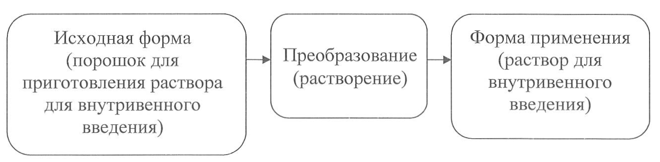 Для лекарственных форм, требующих преобразования перед введением, наименование включает в себя наименования обеих форм (основных элементов), соединенные словосочетанием "для приготовления", с добавлением (при необходимости) дополнительных элементов - признак пути введения или способ применения (для формы применения). Например, "лиофилизат для приготовления раствора для внутривенного введения", где "лиофилизат" - исходная форма, "раствор" - форма применения, "для приготовления" - признак готовности к применению, "для внутривенного введения" - признак пути введения.