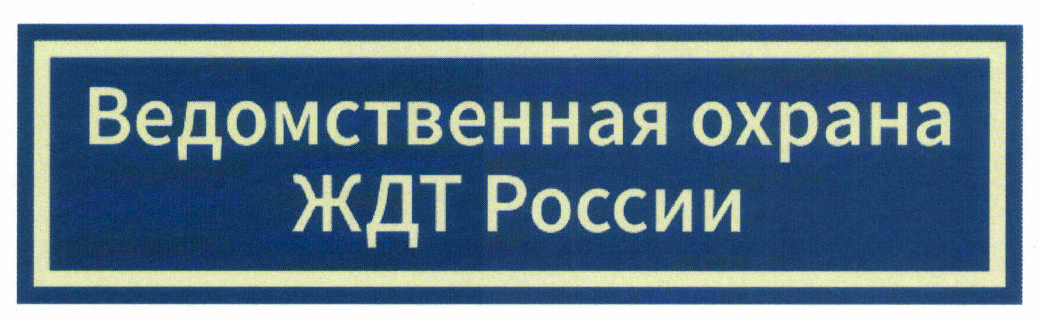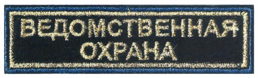 нагрудная нашивка "Ведомственная охрана ЖДТ России", штампованная из синтетического материала на тканевом основании (пришивается над клапаном левого кармана);