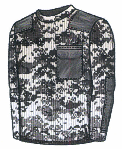 6. Джемпер трикотажный полушерстяной (рисунок № 7) КМФ-расцветки с налокотниками и плечевыми накладками из ткани, горловина круглой формы, низ рукавов обработан двойной резинкой. На левой стороне полочки расположен нагрудный карман с клапаном из ткани. Предусмотрен для ношения с утепленным костюмом.