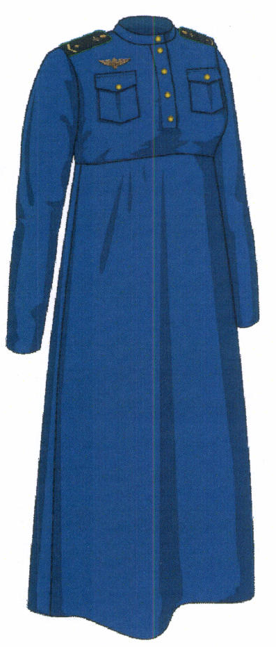 7. Платье женское повседневное (рисунок № 8) из смесовой ткани темно-синего цвета. С отрезным лифом и юбкой длины "макси" без подкладки. Предназначается для старшего, среднего и младшего составов.