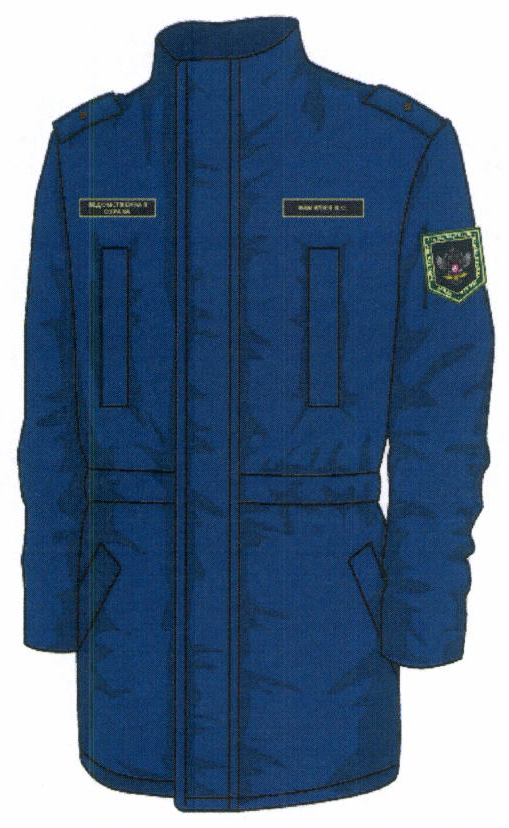 На полочки настрочены накладные нагрудные и боковые карманы с клапанами, застегивающимися на потайную контактную ленту, и двумя наклонными байтовыми складками. На клапаны нагрудных карманов настрочены петельные части контактной ленты для крепления нашивки "ВЕДОМСТВЕННАЯ ОХРАНА" (на правом клапане кармана) и фамильной нашивки (на левом клапане кармана). На полочках куртки под проймами - вентиляционные вставки из двойного сетчатого трикотажного полотна. В области плечевых швов в шов втачивания рукавов в проймы втачаны погоны-хлястики, застегивающиеся на кнопку. Спинка с кокеткой и двумя складками. На уровне талии расположены хлястики для регулировки объема с помощью одной обметанной петли и двух пуговиц.
