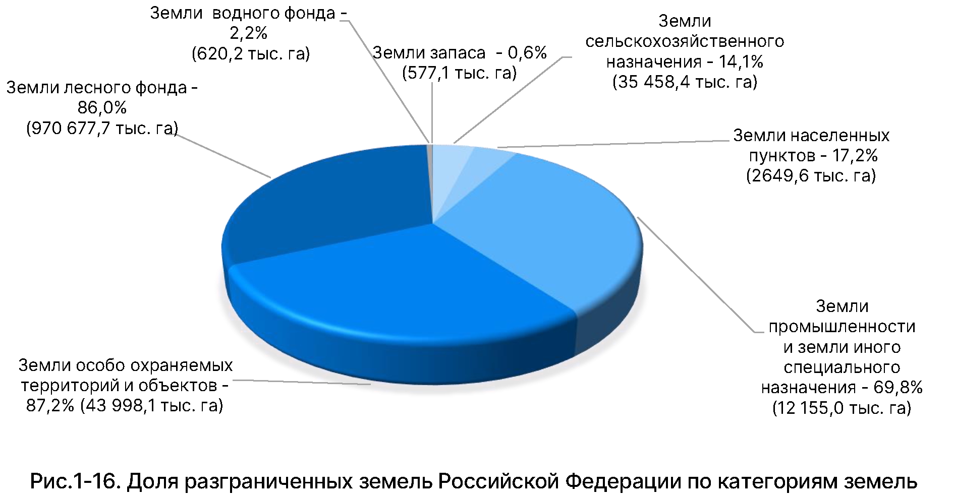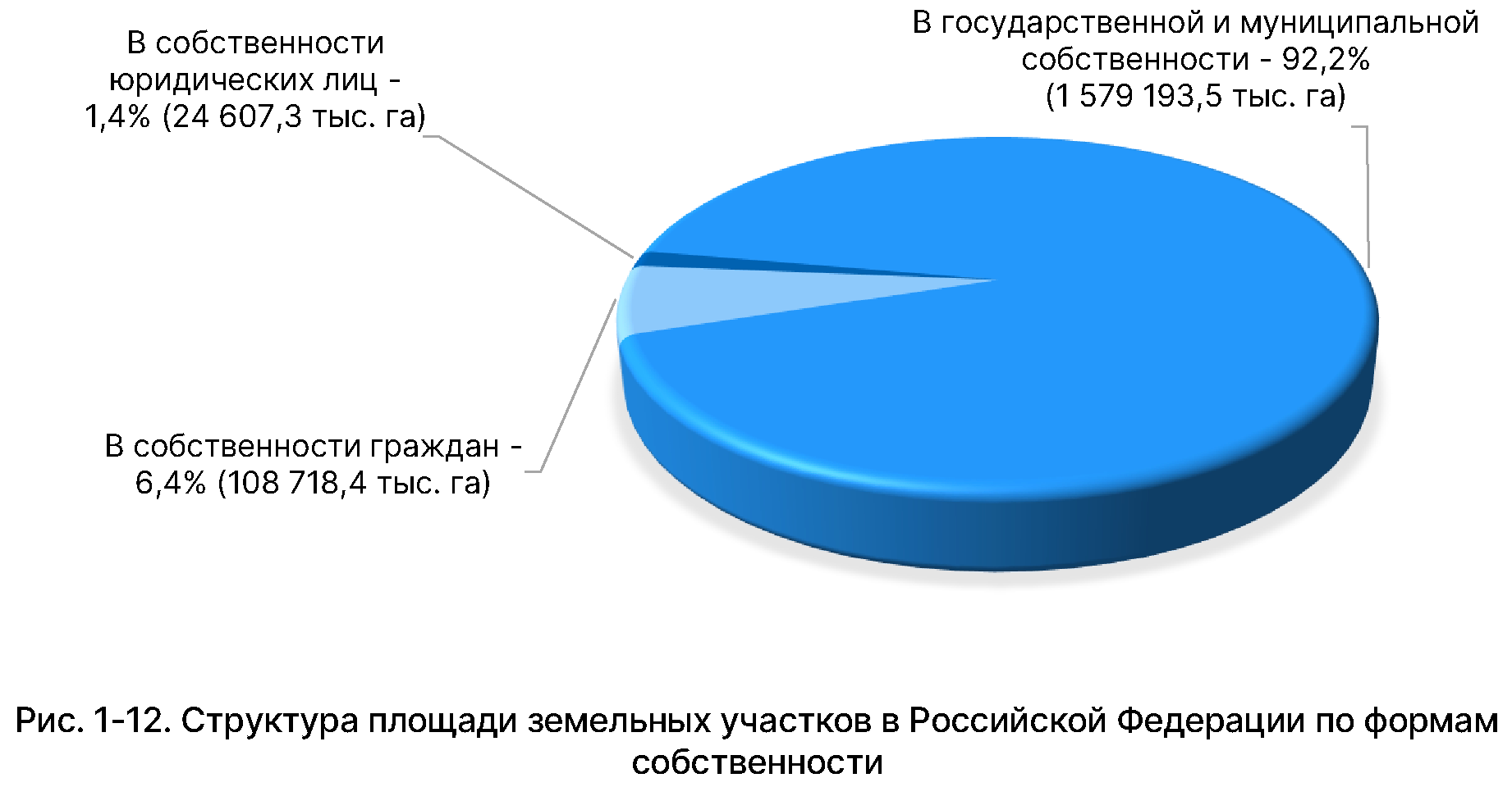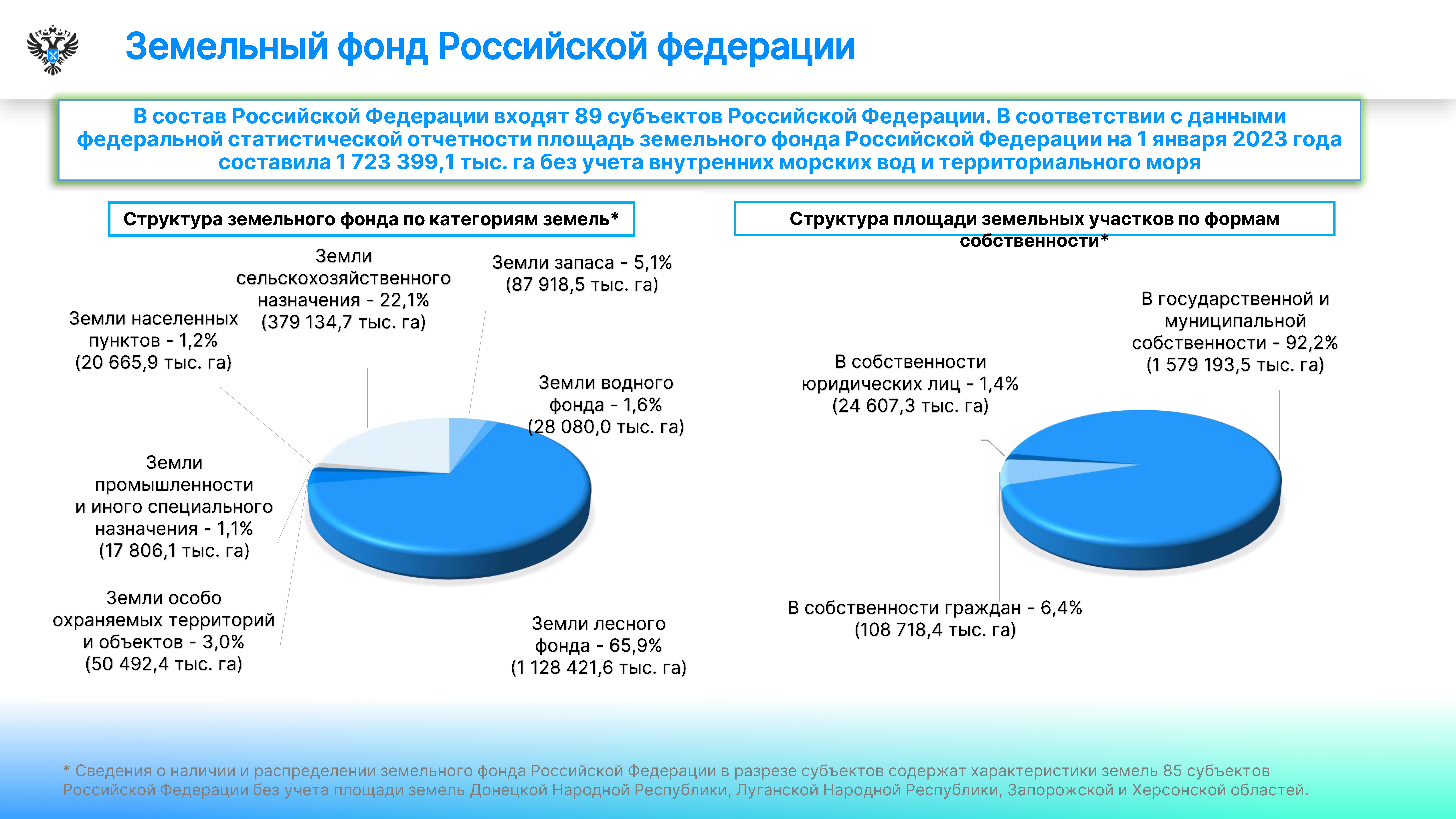 В соответствии с данными федеральной статистической отчетности площадь земельного фонда Российской Федерации на 1 января 2023 года составила 1 723 399,1 тыс. га без учета внутренних морских вод и территориального моря.