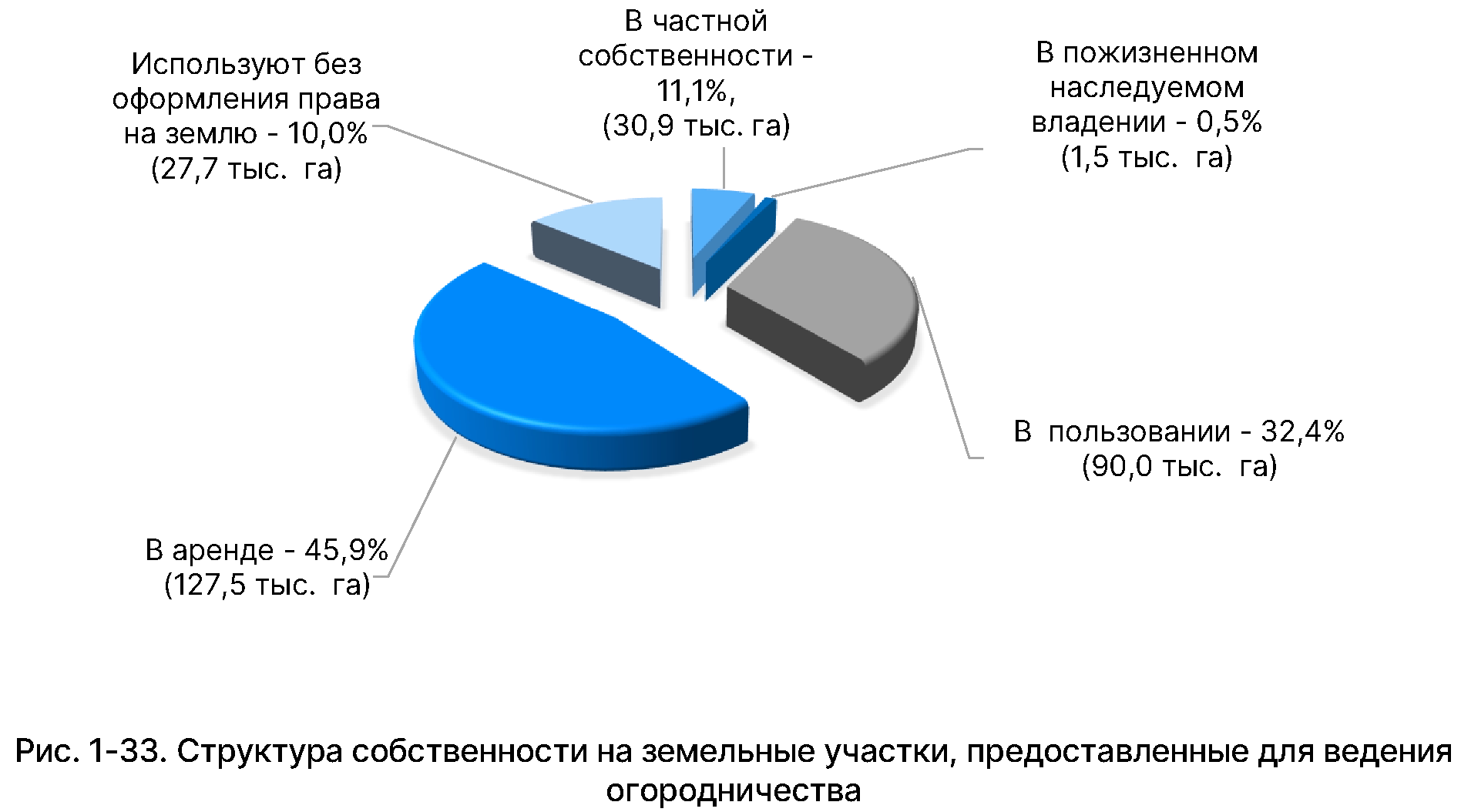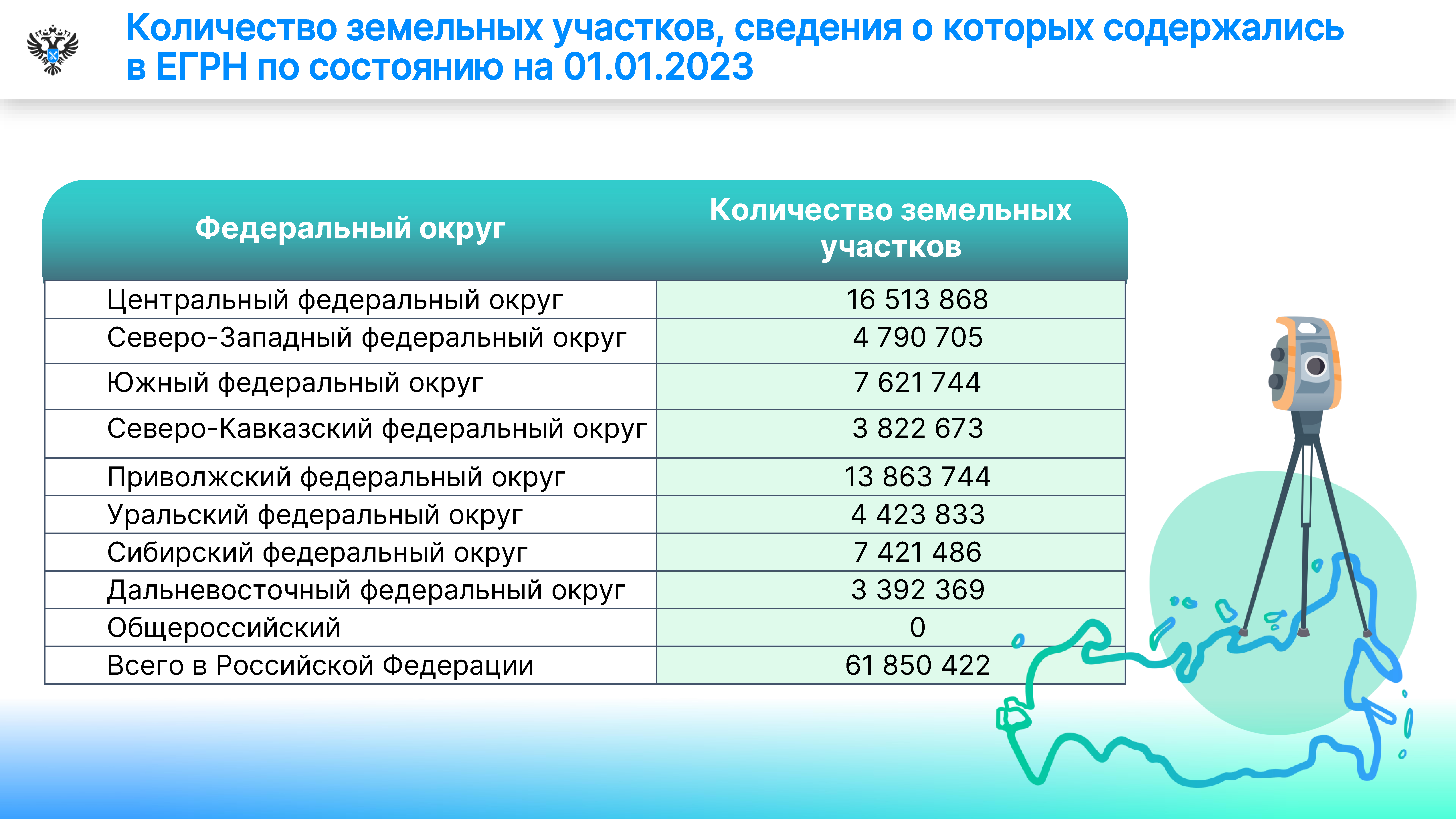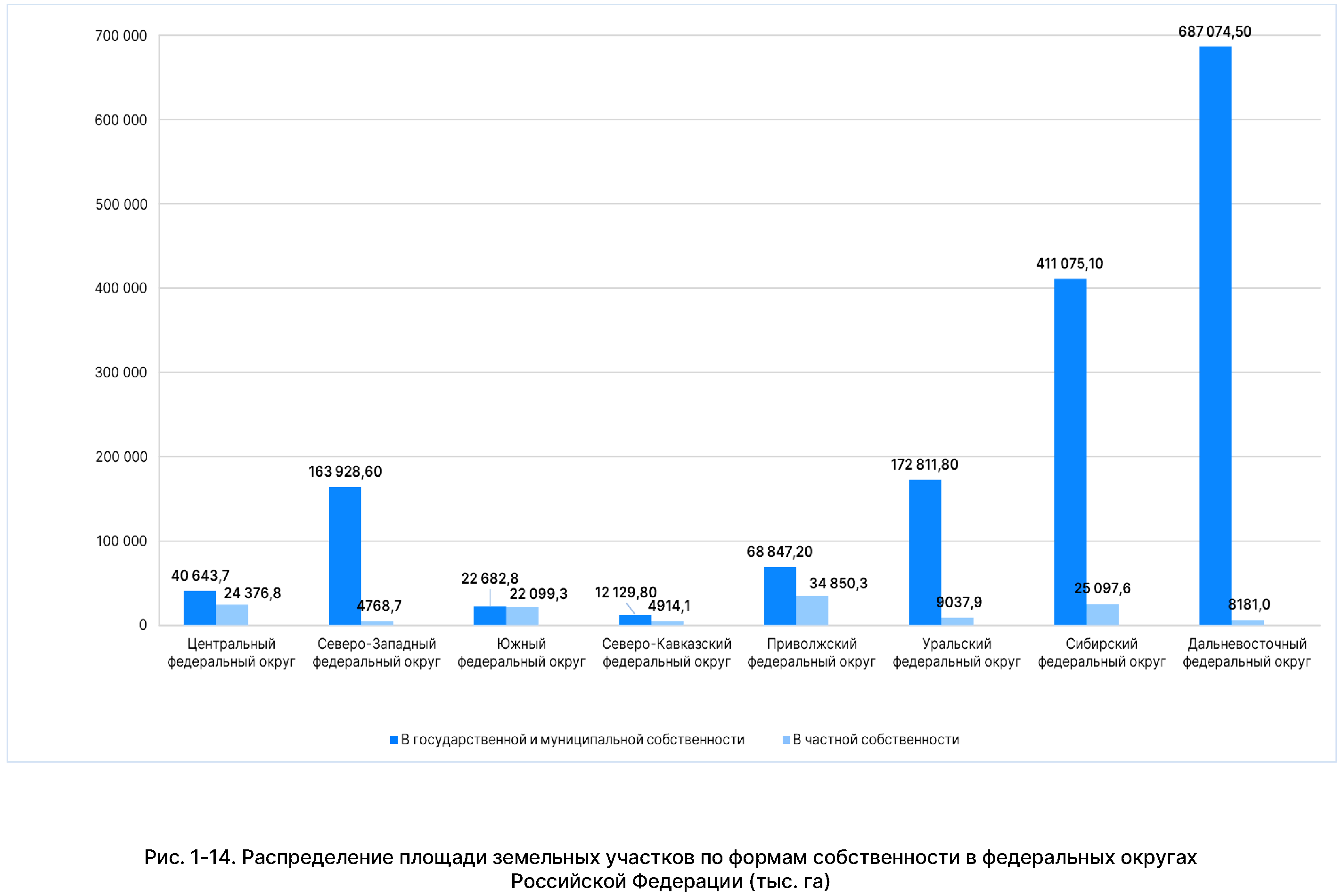 В соответствии с данными федеральной статистической отчетности площадь земельного фонда Российской Федерации на 1 января 2023 года составила 1 723 399,1 тыс. га без учета внутренних морских вод и территориального моря.