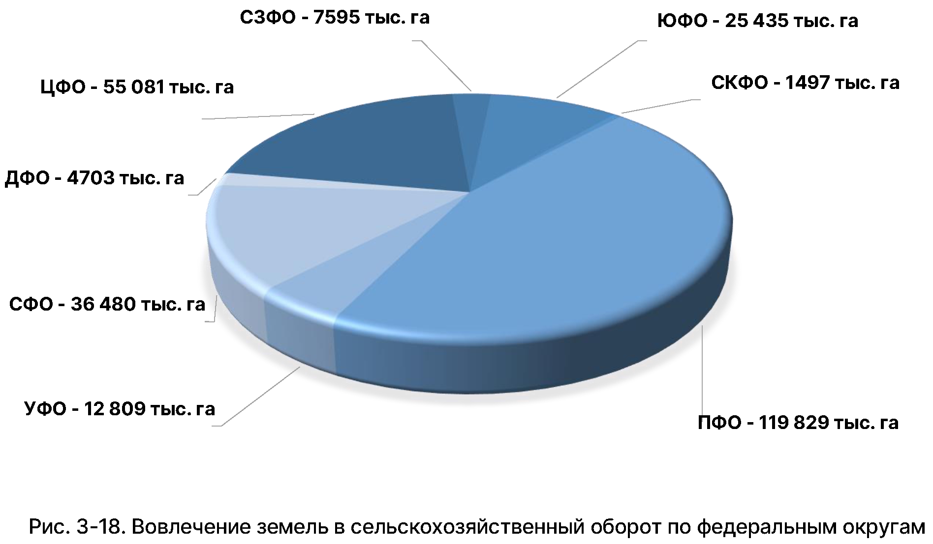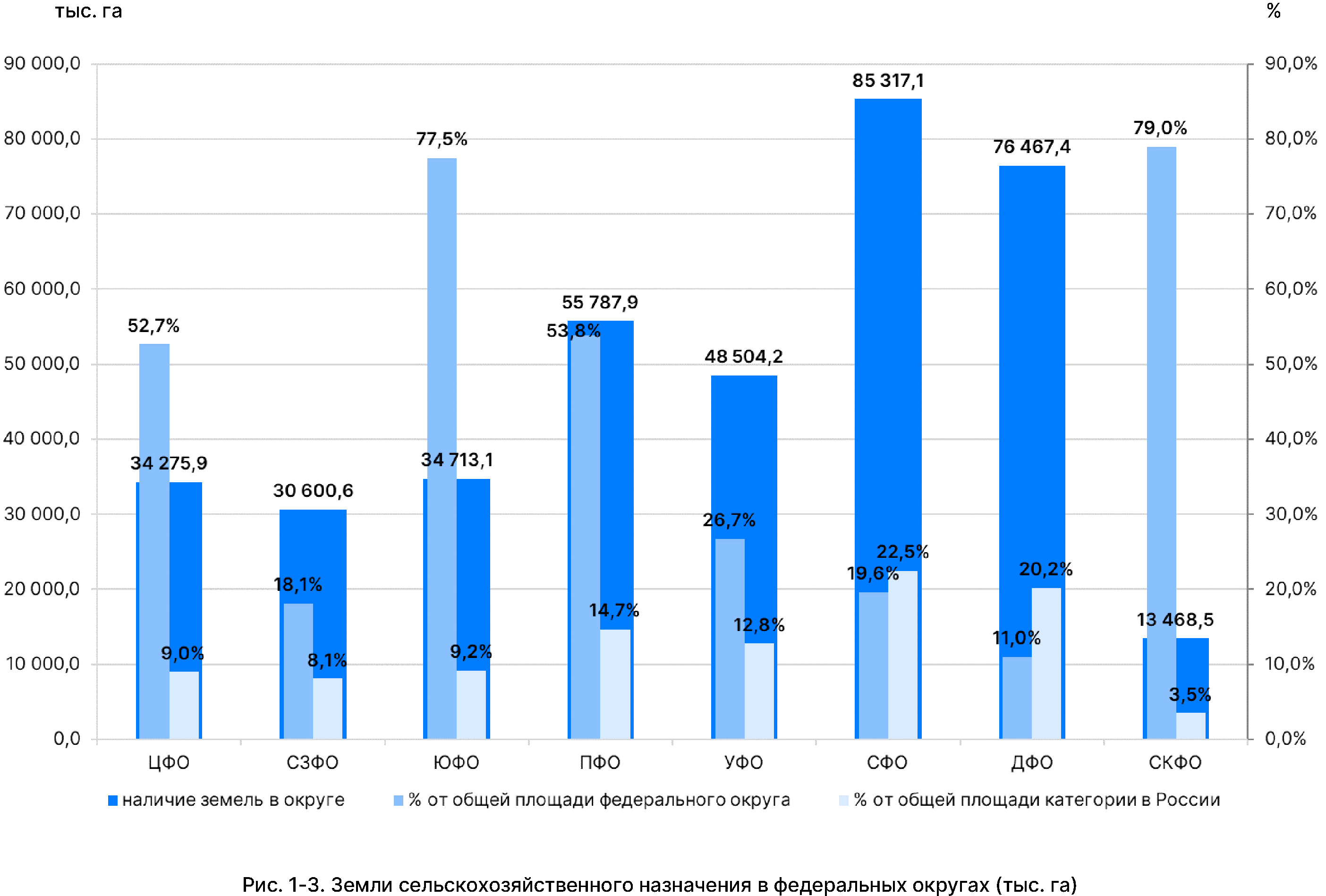 Распределение земель категории сельскохозяйственного назначения по федеральным округам представлено на рисунке 1-3.