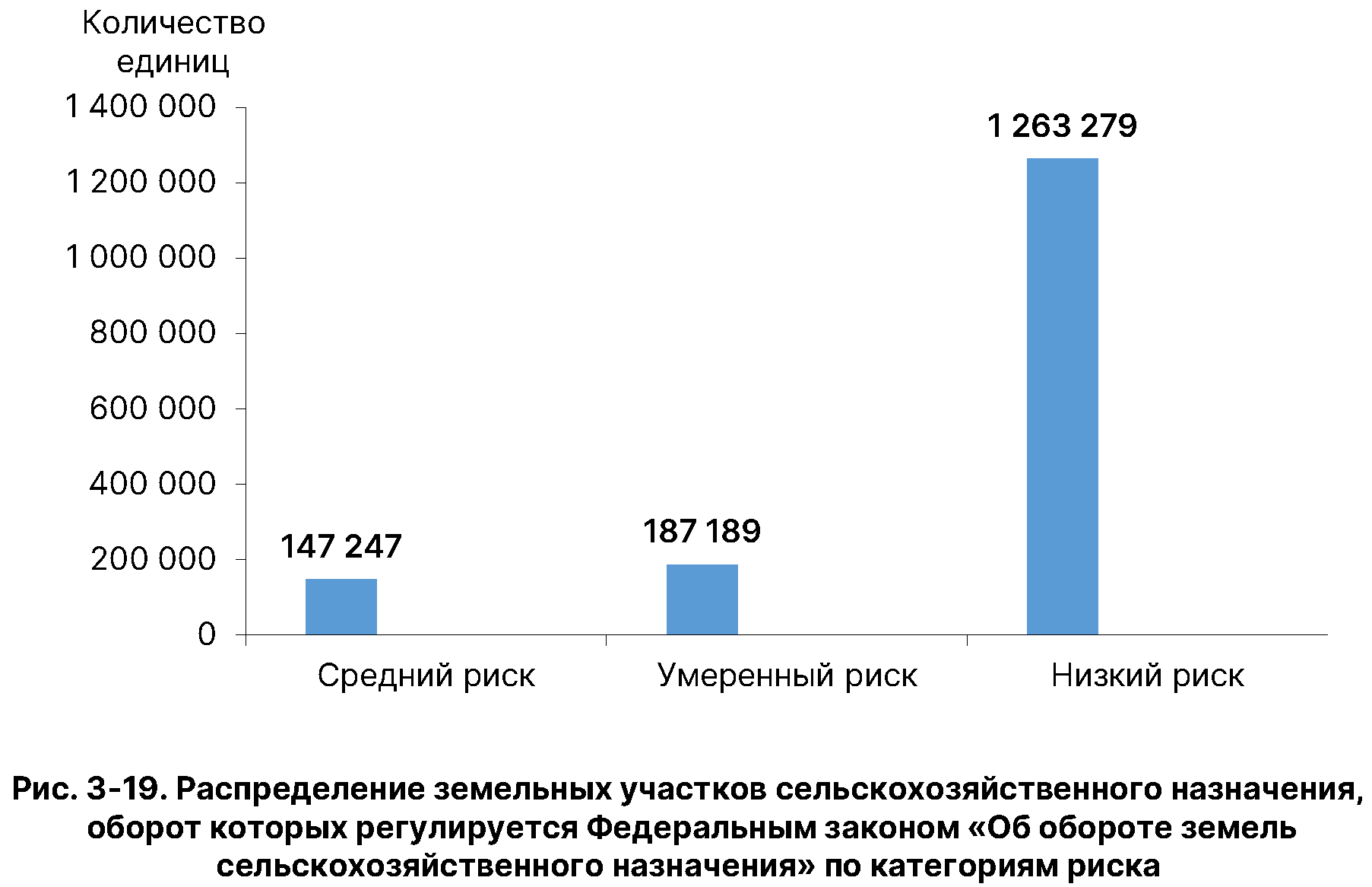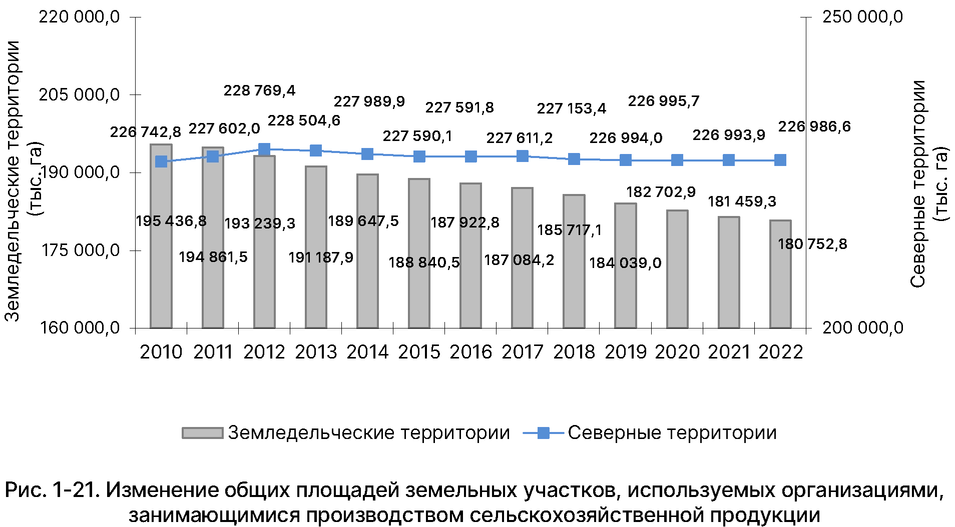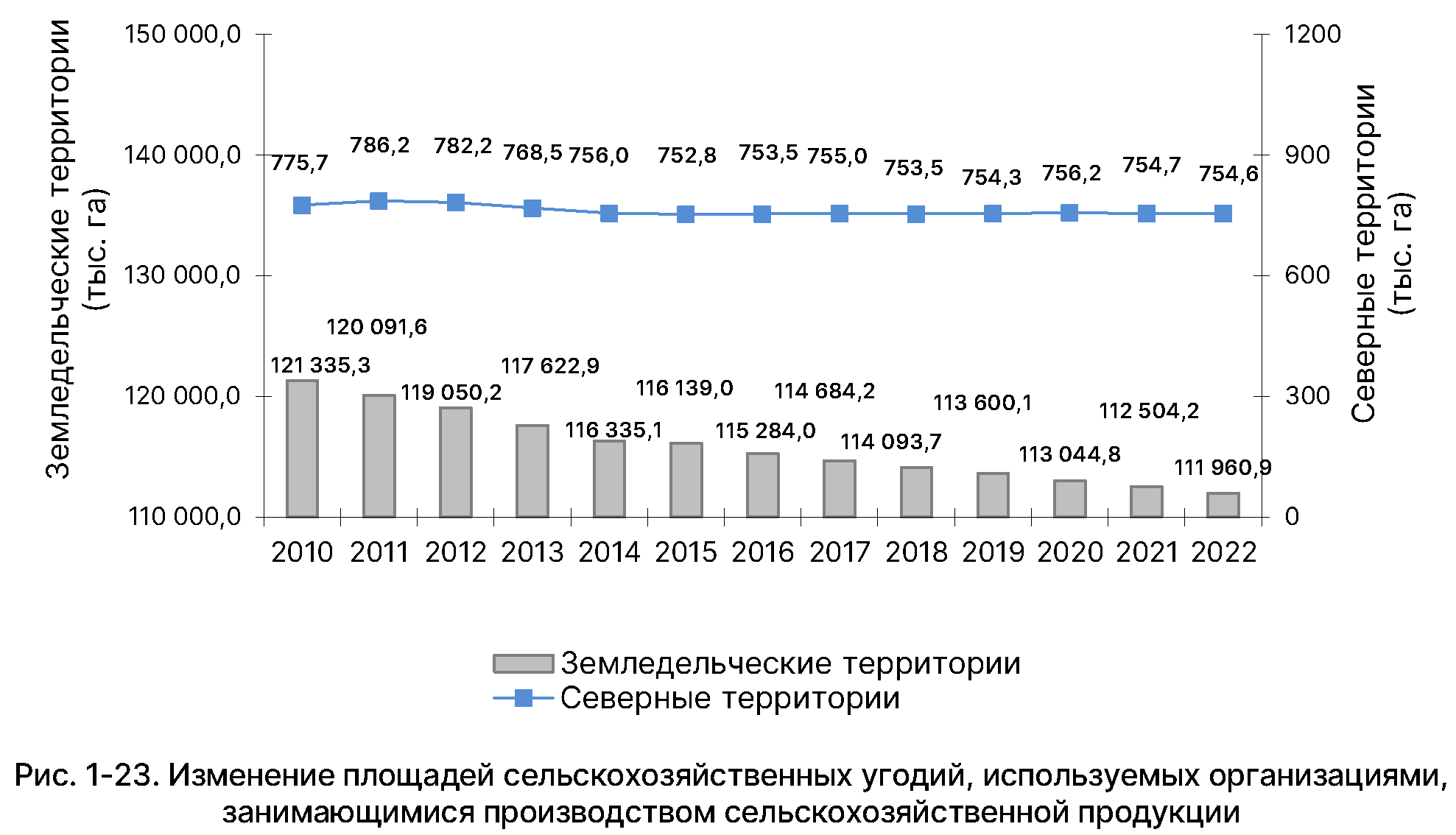На 1 января 2023 года площадь земель сельскохозяйственного назначения составила 379 134,7 тыс. га. В сравнении с предшествующим годом площадь категории земель сельскохозяйственного назначения в составе земельного фонда Российской Федерации уменьшилась на 543,7 тыс. га.