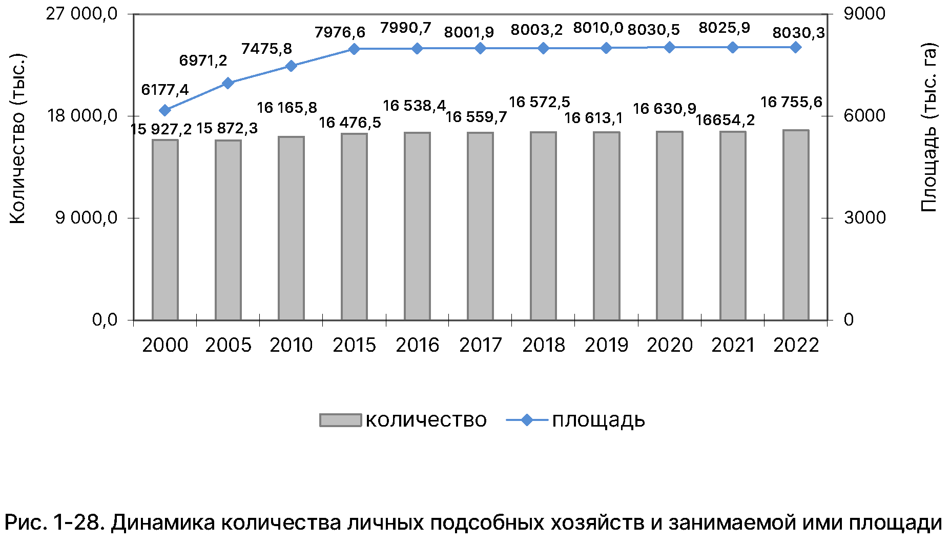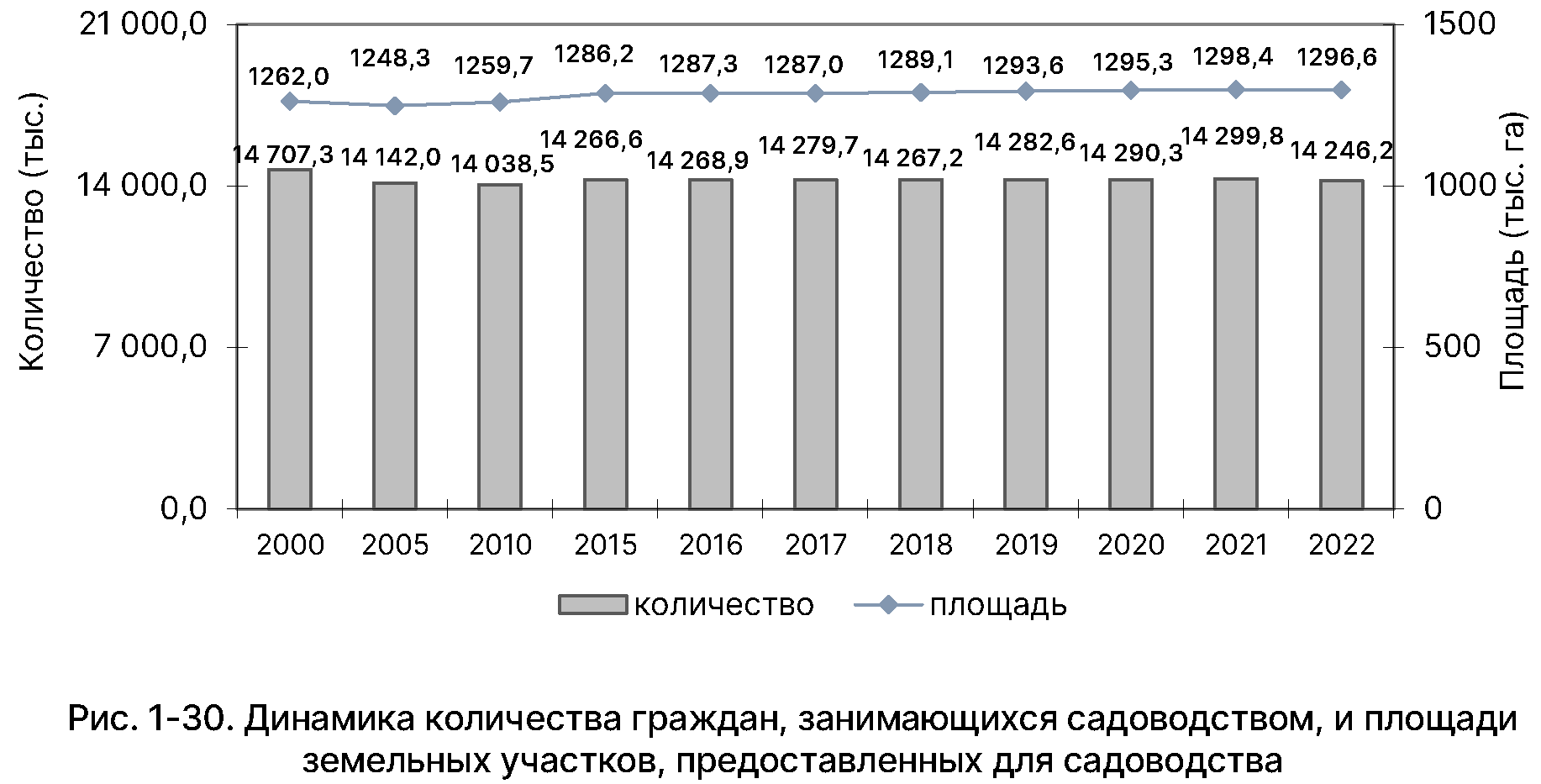 За 2022 год общая площадь категории земель сельскохозяйственного назначения, не предоставленных в пользование и включенных в состав земель фонда перераспределения, уменьшилась на 325,8 тыс. га и на отчетную дату составила 42 320,2 тыс. га. Площадь сельскохозяйственных угодий, вошедших в фонд перераспределения, уменьшилась на 229,0 тыс. га и составила 11 011,0 тыс. га, при этом площадь пашни уменьшилась на 92,0 тыс. га и составила 3159,9 тыс. га (таблица 1.1). Изменения площади земель фонда перераспределения, сельскохозяйственных угодий в его составе, в том числе пашни, представлены на рисунке 1-2.