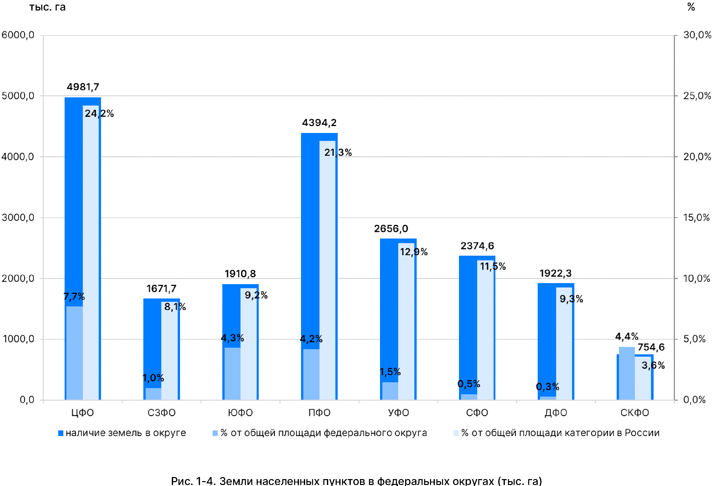 На 1 января 2023 года площадь городских населенных пунктов составила 8402,1 тыс. га, сельских населенных пунктов - 12 263,8 тыс. га. К городским населенным пунктам отнесены города и поселки, к сельским - села, станицы, деревни, хутора, кишлаки, аулы, стойбища, заимки и иные населенные пункты.