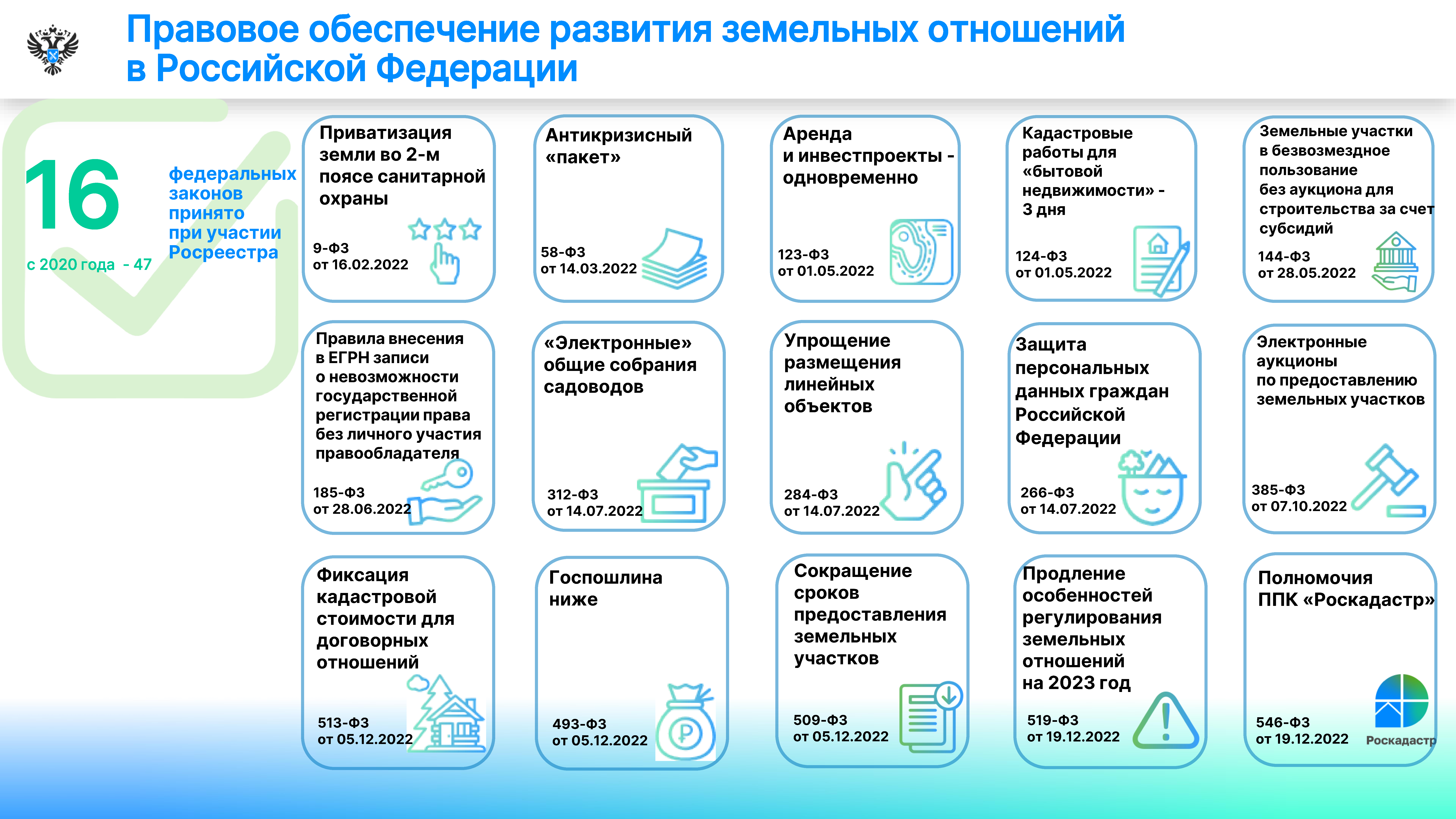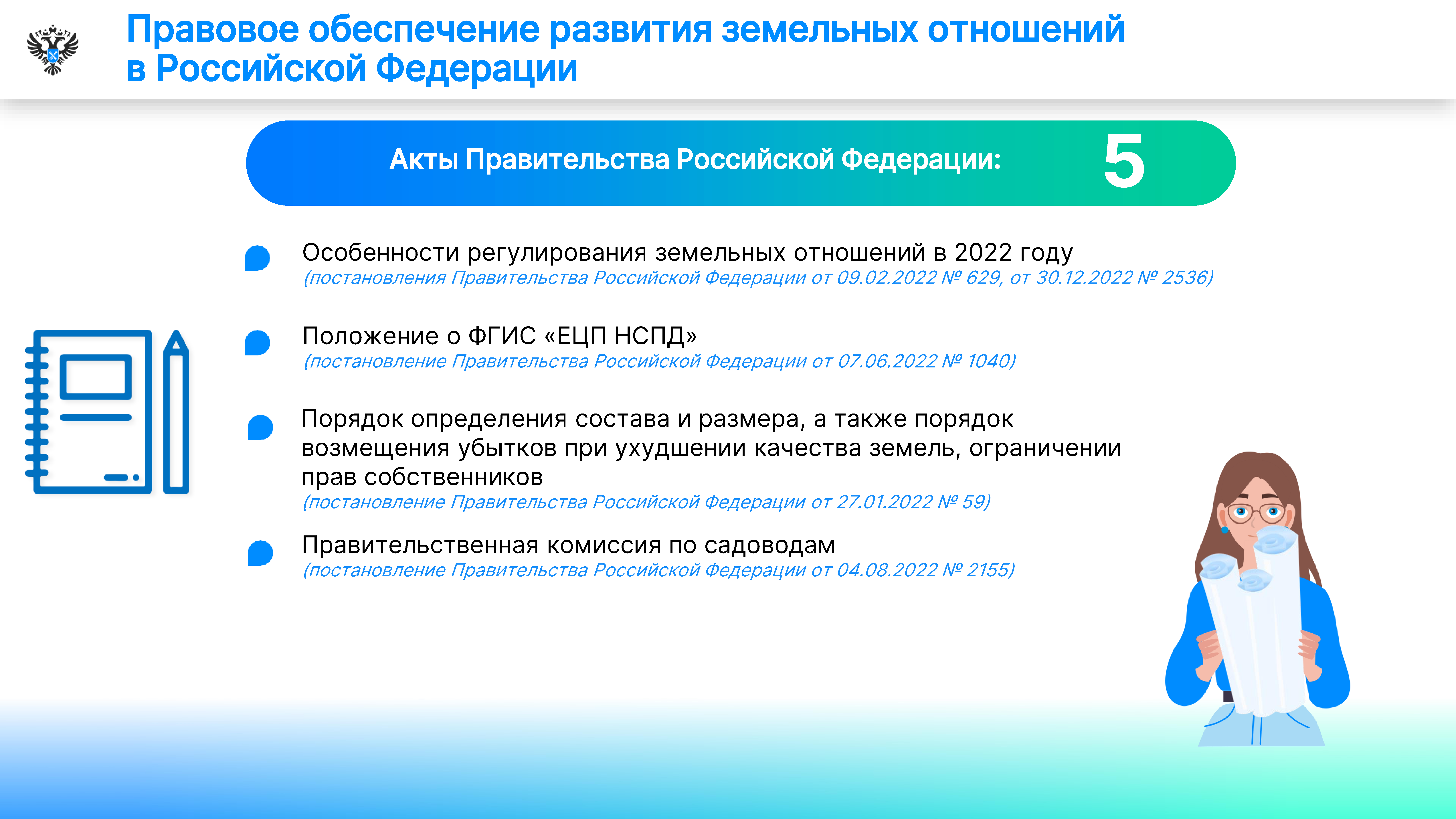 Федеральной службой государственной регистрации, кадастра и картографии в целях информационного обеспечения подготовлен государственный (национальный) доклад о состоянии и использовании земель в Российской Федерации в 2022 году (далее - Доклад).