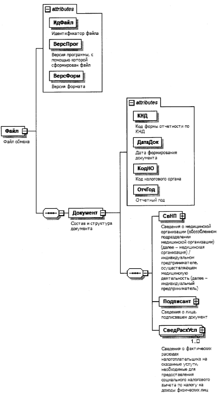 | Сведения о фактических расходах налогоплательщика на оказанные услуги, необходимые для предоставления социального налогового вычета по налогу на доходы физических лиц | СведРасхУсл | С | ОМ | Состав элемента представлен в таблице 4.8 |