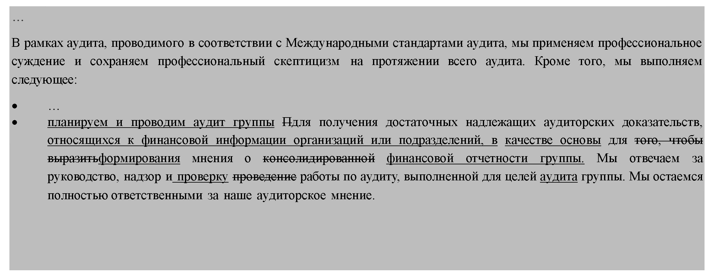 Представленные далее согласующиеся поправки к другим международным стандартам являются результатом утверждения МСА 600 (пересмотренного). Эти согласующиеся поправки вступают в силу одновременно с МСА 600 (пересмотренным) и показаны выделением в тексте последней утвержденной версии тех международных стандартов, в которые они вносятся. Номера сносок внутри этих поправок не соотносятся с МСА, в которые вносятся поправки, поэтому необходимо делать ссылки на соответствующие стандарты.