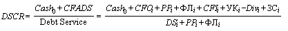 3. DSCR (Debt Service Coverage Ratio) - показатель покрытия обязательств по погашению и обслуживанию основного долга, рассчитываемый с даты подписания акта о вводе объекта (объектов) инвестиционного проекта в эксплуатацию (при наличии нескольких актов - с даты подписания первого акта) и до окончания срока действия кредита по следующей формуле: