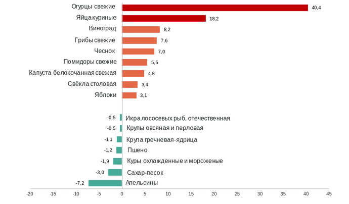 На отдельные виды плодоовощной продукции цены изменились: на огурцы +40,4%, виноград +8,2%, грибы свежие +7,6%, чеснок +7,0%, помидоры +5,5%, капусту белокочанную +4,8%, свеклу +3,4%, яблоки +3,1%, лук репчатый +3,0%, морковь +2,8%. В то же время цены на апельсины снизились на 7,2%.