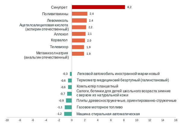 В декабре цены на лекарственные препараты, не относящиеся к жизненно необходимым и важнейшим лекарственным препаратам (ЖНВЛП), в среднем изменились на +1,2%, в том числе на синупрет +8,2%, левомеколь и поливитамины +2,4%, аллохол +2,1%, корвалол +2,0%, метамизол натрия (анальгин отечественный) +1,9%, валерианы экстракт и эргоферон +1,6%, валидол +1,3%, нафазолин +1,2%.