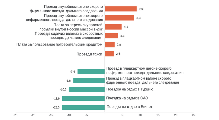 В декабре в группе услуг пассажирского транспорта изменение цен составило: на проезд в купейных и сидячих вагонах в поездах дальнего следования от +3,8% до +9,0%, проезд в такси +2,6%, авиаперелет экономическим классом +2,1%, проезд в междугороднем автобусе +1,0%, городском автобусе и маршрутном такси +0,7%, троллейбусе +0,5%, метро +0,3%, трамвае +0,2%. В то же время снизились цены на проезд в плацкартных вагонах в поездах дальнего следования - от 7,6% до 8,8%.