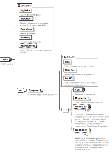 | Сведения о движении денежных средств и иных финансовых активов по счету (вкладу) в банке и иной организации финансового рынка, расположенных за пределами территории Российской Федерации | ОтчИнСчет | С | НМУ | Состав элемента представлен в таблице 4.7. Элемент должен отсутствовать при значении элемента <НомКорр> = 999 (таблица 4.1). Элемент является обязательным при отсутствии элемента <ОтчИнЭСП> и при значении элемента <НомКорр> Ф 999 (таблица 4.1). Элемент может быть заполнен при наличии элемента <ОтчИнЭСП> и при значении элемента <НомКорр> Ф 999 (таблица 4.1) | |