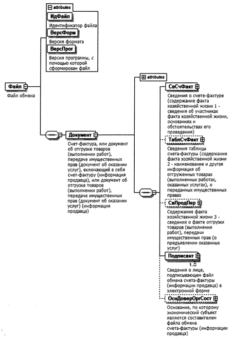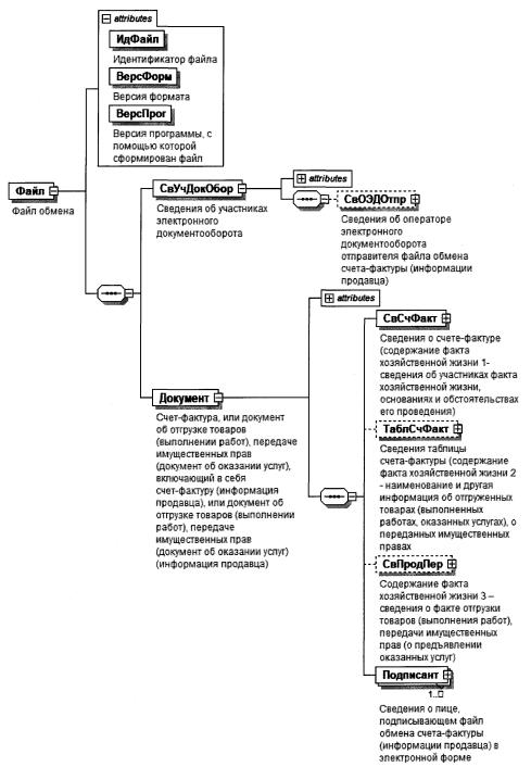 | Сведения о счете-фактуре (содержание факта хозяйственной жизни 1 - сведения об участниках факта хозяйственной жизни, основаниях и обстоятельствах его проведения) | СвСчФакт | С | О | Состав элемента представлен в таблице 5.3 | |