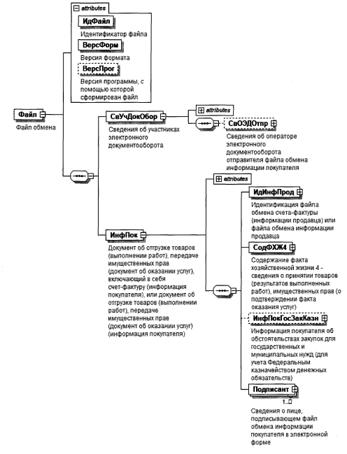 | Документ об отгрузке товаров (выполнении работ), передаче имущественных прав (документ об оказании услуг), включающий в себя счет-фактуру (информация покупателя), или документ об отгрузке товаров (выполнении работ), передаче имущественных прав (документ об оказании услуг) (информация покупателя) | ИнфПок | С | О | Состав элемента представлен в таблице 7.4 |