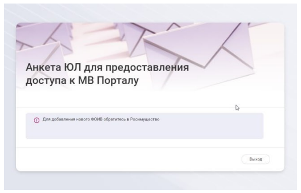 В случае отсутствия личного кабинета у представителей ФОИВ, АО, ООО, ФГУП и ФГУ необходимо обеспечить заполнение анкеты для предоставления доступа к порталу.