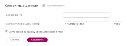 Нажмите на кнопку «Редактировать» в блоке «Контактные данные» - поля «Рабочая почта», «Рабочий телефон, доб. номер» и чек-бокс «Согласен на рассылку уведомлений на e-mail» перейдут в режим редактирования (Рисунок 19).