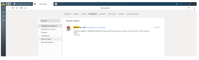 «Расширения». Проверьте наличие «КриптоПро ЭЦП» или активируйте его, нажав «Установить».