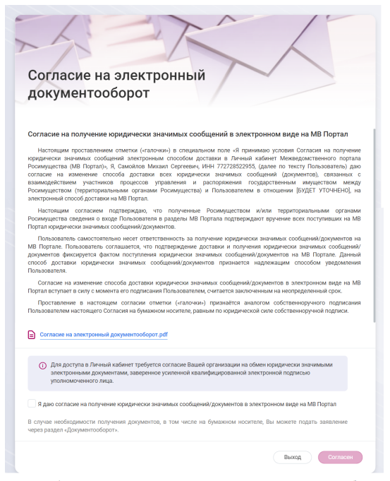 Если авторизация от имени организации на МВ портале происходит впервые, то далее появляется экран с согласием об электронном документообороте (Рисунок 4).