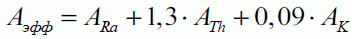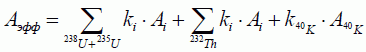 в которой суммирование ведется по всем гамма-излучающим радионуклидам природных рядов 238U и 235U (первое слагаемое), 232Th (второе слагаемое) и 40K (третье слагаемое), а коэффициенты k i учитывают относительный вклад гамма-излучения каждого из природных радионуклидов во внешнее гамма-излучение материала с данным содержанием природных радионуклидов. В условиях радиоактивного равновесия в рядах 238U и 232Th значение А эфф рассчитывается по формуле (2).
