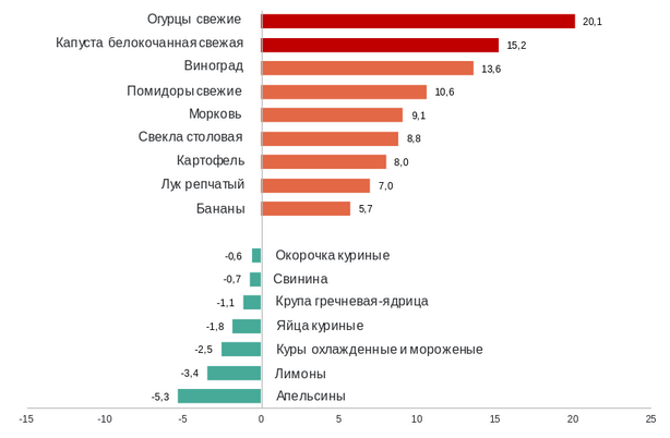 В январе изменились цены на отдельные виды плодоовощной продукции: на огурцы +20,1%, капусту белокочанную +15,2%, виноград +13,6%, помидоры +10,6%, морковь +9,1%, свеклу +8,8%, картофель +8,0%, лук репчатый +7,0%, бананы +5,7%, чеснок +5,6%. Снизились цены на апельсины (-5,3%) и лимоны (-3,4%).