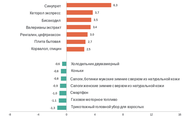 В январе цены на лекарственные препараты, не относящиеся к жизненно необходимым и важнейшим лекарственным препаратам (ЖНВЛП), в среднем изменились на +1,9%, в том числе на синупрет +6,3%, кеторол экспресс +3,7%, валерианы экстракт +3,4%, ренгалин +3,0%, корвалол +2,5%, алмагель и валидол +2,4%, комбинированные анальгетики +2,3%, аллохол и сульфацетамид +2,2%, метамизол натрия (анальгин отечественный), поливитамины и ингалипт +2,0%, таурин +1,9%.