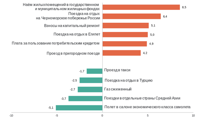 Среди услуг зарубежного туризма изменились цены: на отдых в Египет +5,0%, ОАЭ и отдельные страны Юго-Восточной Азии +0,9%, страны Закавказья +0,8%. Снизились цены: на поездки в отдельные страны Средней Азии (-3,7%), Турцию (-2,5%), Беларусь (-0,3%).