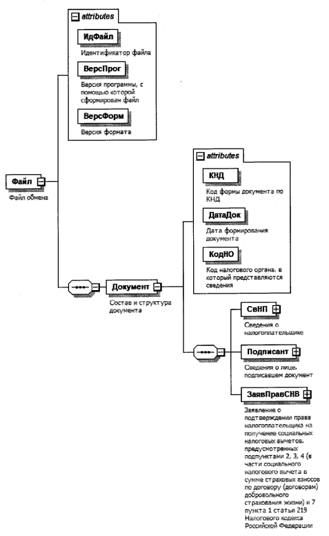 | Заявление о подтверждении права налогоплательщика на получение социальных налоговых вычетов, предусмотренных подпунктами 2, 3, 4 (в части социального налогового вычета в сумме страховых взносов по договору (договорам) добровольного страхования жизни) и 7 пункта 1 статьи 219 Налогового кодекса Российской Федерации | ЗаявПравСНВ | С | О | Состав элемента представлен в таблице 4.9 |