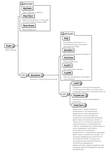 | Заявление о предоставлении заключения о не выявленных (выявленных) при проведении налогового контроля фактах искажения организацией размеров фактически понесенных затрат, а также об отсутствии (о наличии) невыполненных мотивированных мнений, направленных организации в ходе проведения налогового мониторинга по вопросам правильности определения размеров фактически понесенных затрат, по которым Федеральным законом от 01.04.2020 N 69-ФЗ "О защите и поощрении капиталовложений в Российской Федерации" предусмотрено предоставление мер государственной поддержки (далее - заключение) | ЗаявЗакл | С | О | Состав элемента представлен в таблице 4.7 |