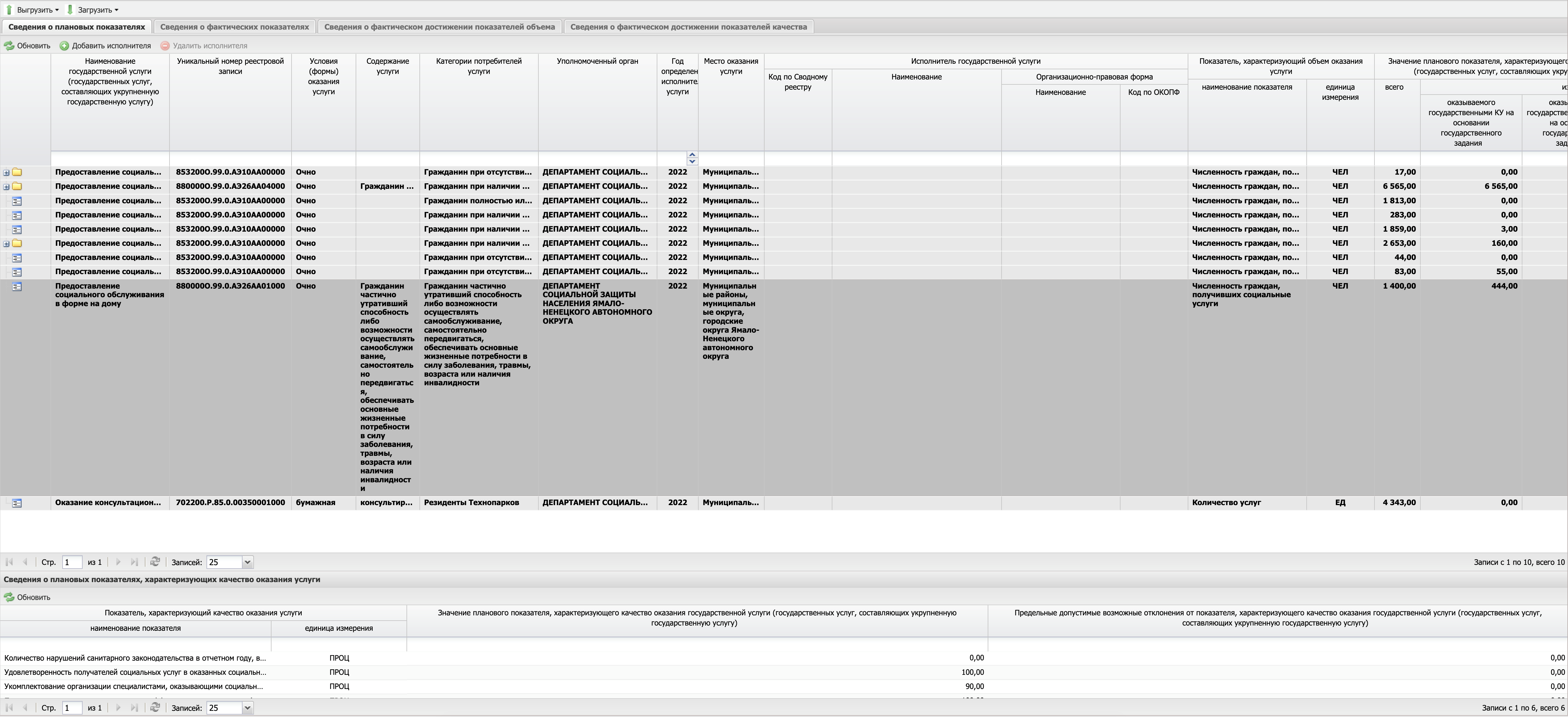 В разделе «Сведения о плановых показателях, характеризующих объем и качество оказания государственных (муниципальных) услуг (укрупненной государственной (муниципальной) услуги)» отображается информация о наименовании укрупненной государственной услуги, а также о наименовании государственной (муниципальной) услуги (государственных(муниципальных) услуг, составляющих укрупненную государственную (муниципальную) услугу), исполнителе государственной услуги, условиях (формах) оказания услуги, содержании услуги, категориях потребителей услуги, месте оказания услуги, а также информация о предельных допустимых возможных отклонениях от показателей, характеризующих объем и качество оказания услуги.
