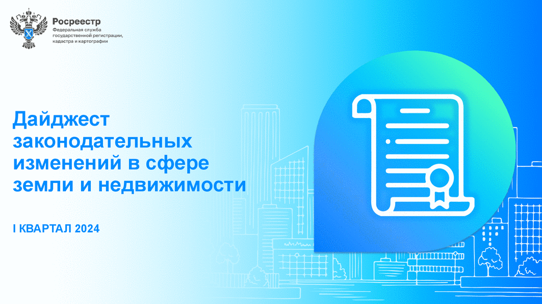 Обзор законодательных изменений в сфере земли и недвижимости "Дайджест законодательных изменений в сфере земли и недвижимости. I квартал 2024" (официальный сайт Федеральной службы государственной регистрации, кадастра и картографии, раздел "Обзор законов о недвижимости", 15 мая 2024 г.)"
