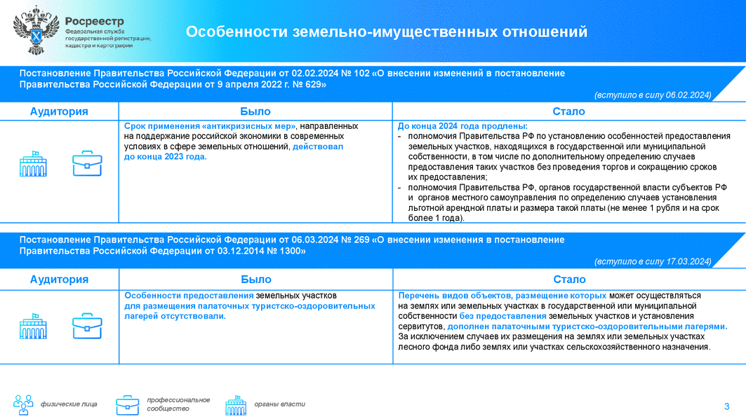 Постановлением Правительства РФ N 102 (от 2 февраля 2024 г.) в интересах бизнеса срок действия "Антикризисных мер", направленных на поддержание российской экономики в сфере земельных отношений, продлен до конца 2024 года.