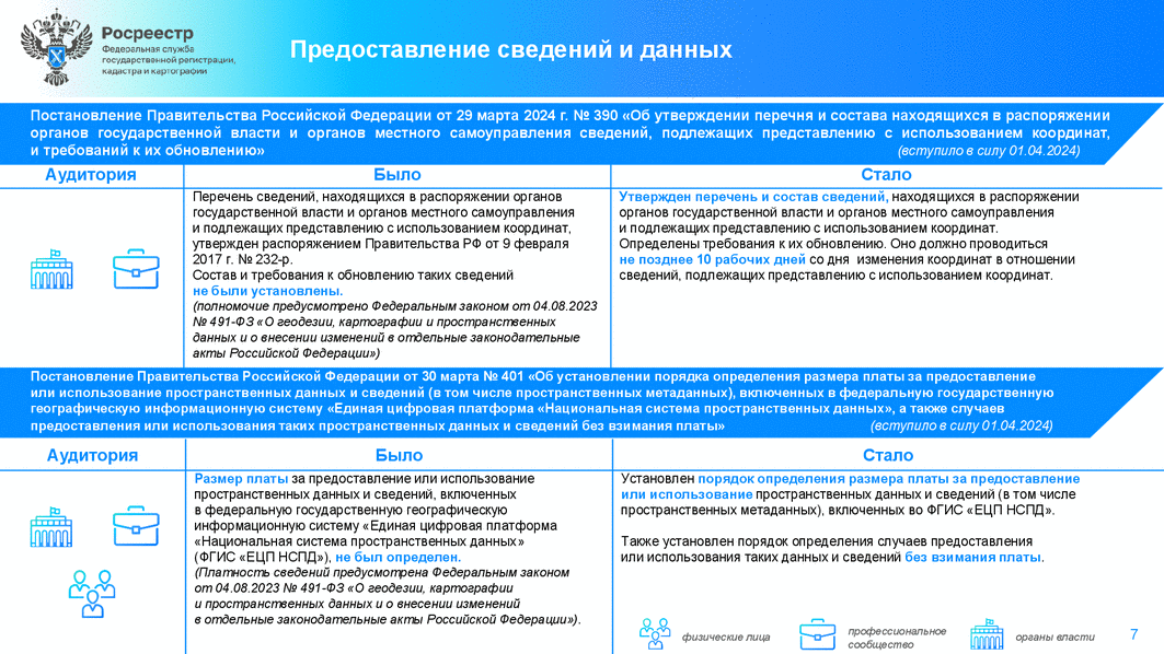 Постановлением Правительства РФ N 401 (от 30 марта 2024 г.) установлен порядок определения размера платы за предоставление или использование пространственных данных и сведений, включенных во ФГИС "Единая цифровая платформа "Национальная система пространственных данных". Также установлен порядок определения случаев предоставления или использования таких данных без взимания платы.