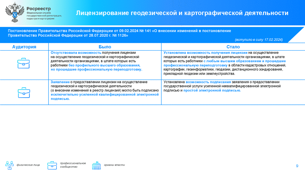 Постановлением Правительства РФ N 141 (от 9 февраля 2024 г.) установлена возможность получения лицензии на осуществление геодезической и картографической деятельности организациями, в штате которых есть работники с любым высшим образованием и прошедшие профессиональную переподготовку в области кадастровых отношений, картографии, геоинформатики, геодезии, дистанционного зондирования, прикладной геодезии или землеустройства.