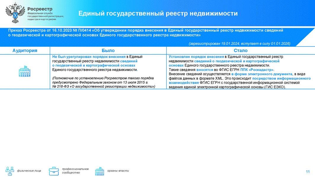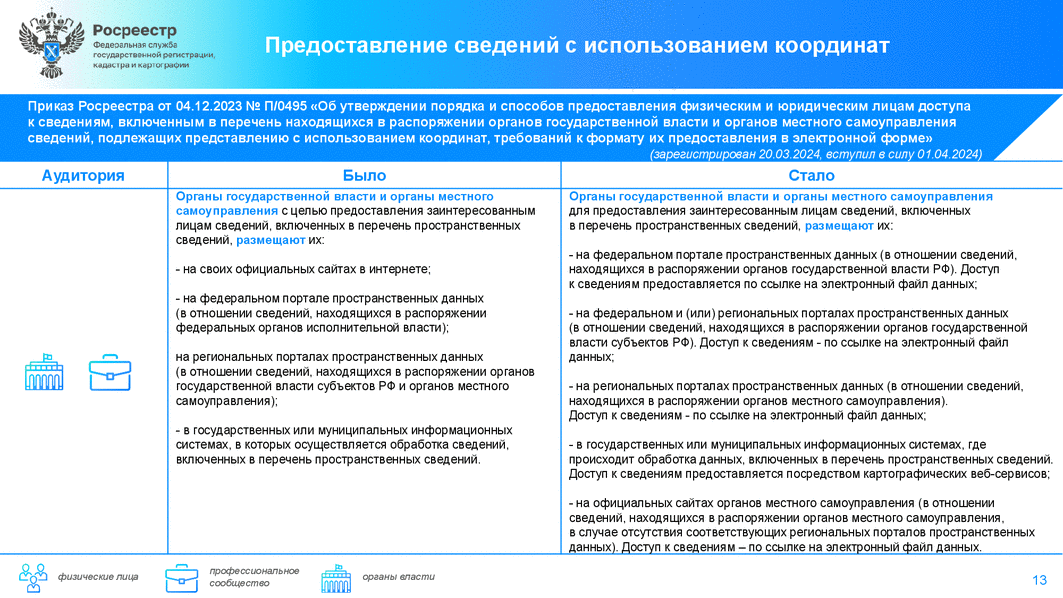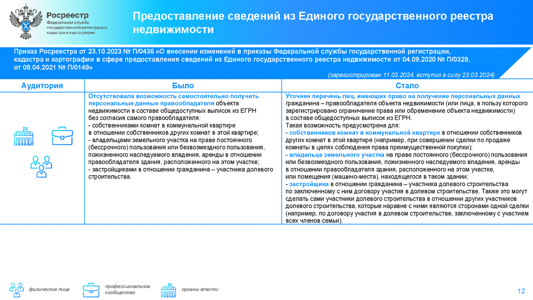 Приказом Росреестра N П/0436 (от 23 октября 2023 г.) уточнен перечень лиц, имеющих право на получение персональных данных гражданина - правообладателя объекта недвижимости в составе общедоступных выписок из ЕГРН. Теперь такая возможность предусмотрена для: