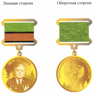 Ведомственный знак отличия Федерального агентства лесного хозяйства "Петр Антипов" (далее - Знак) представляет собой медальон в виде круга диаметром 30 мм, выполненный из металла золотистого цвета с выпуклым бортиком с обеих сторон. Медальон подвешен на колодку из муаровой ткани зеленого цвета, обрамленную металлом золотистого цвета. С нижнего края муаровой ткани оранжевая полоса шириной 8 мм окаймлена двумя черными полосами шириной 2 мм. Размер колодки 30 х 20 мм.