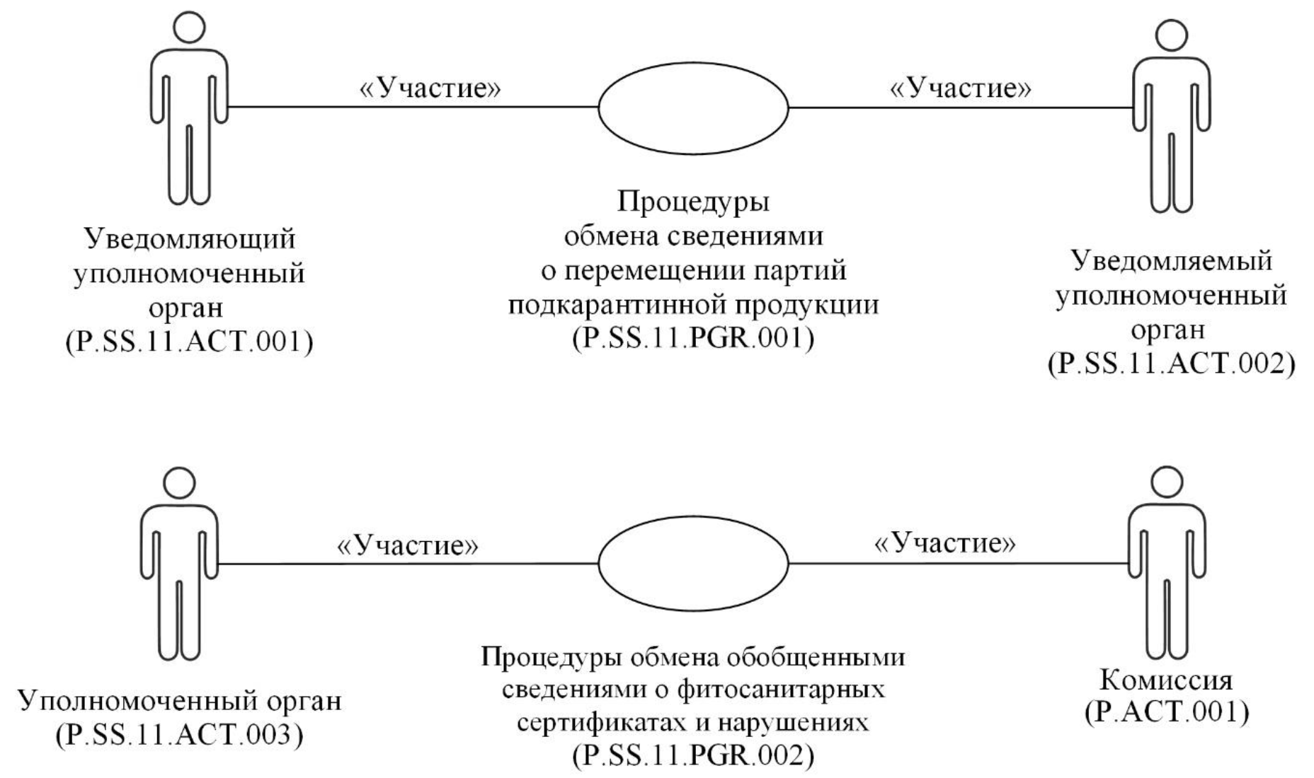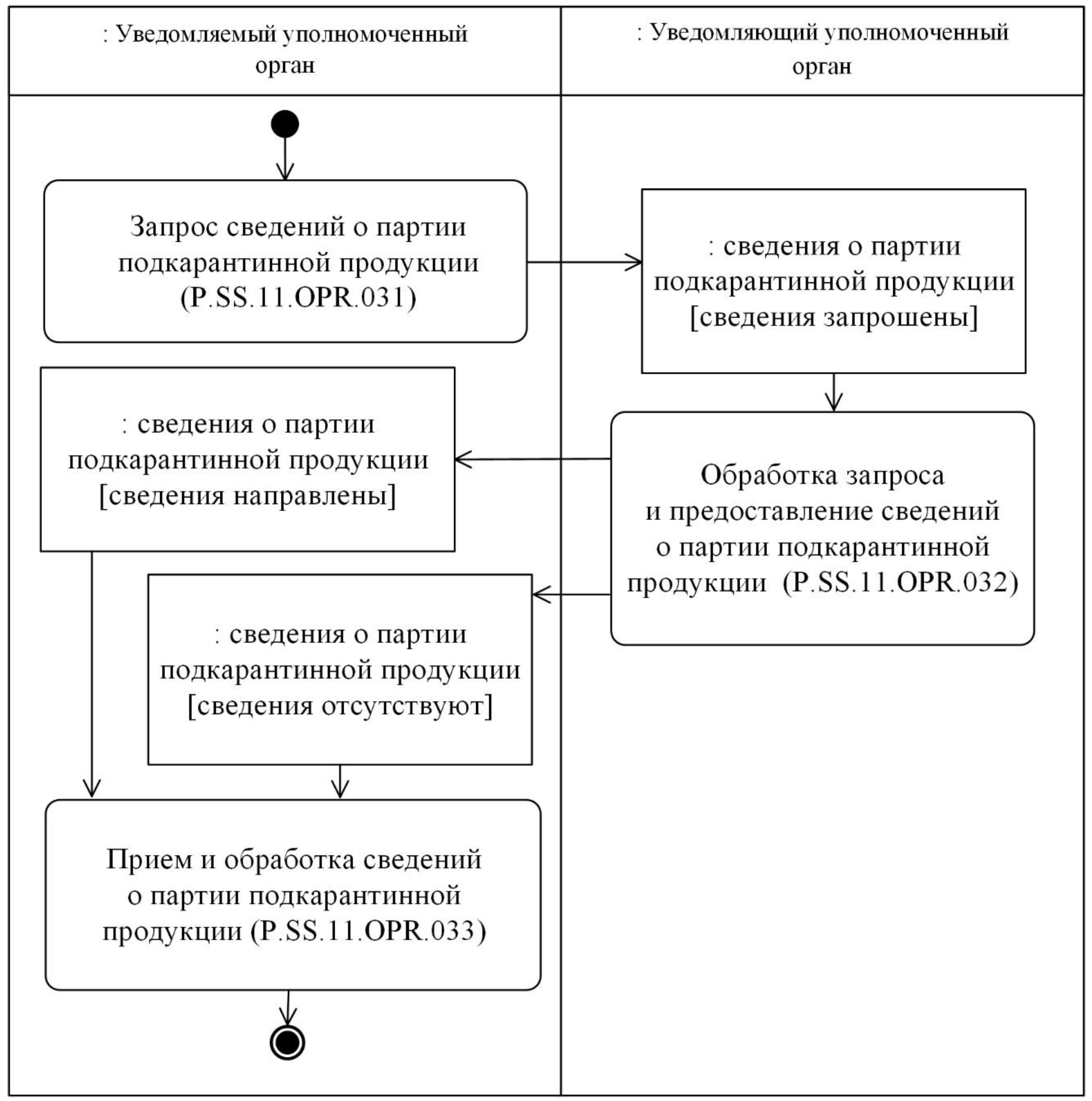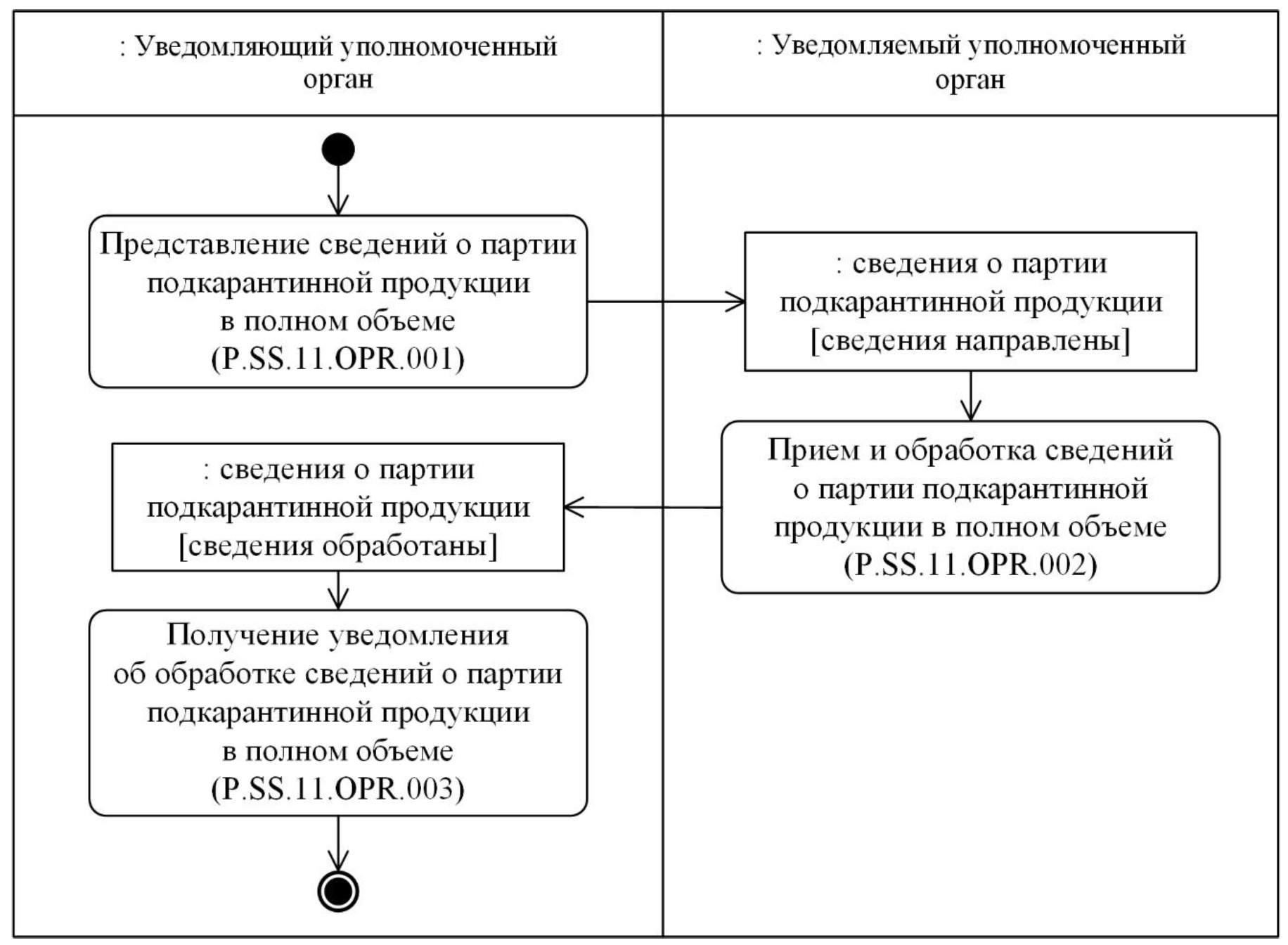 | P.SS.11.ACT.001 | уведомляющий уполномоченный орган | уполномоченный орган государства - члена, который осуществляет: представление в уведомляемый уполномоченный орган сведений о партиях подкарантинной продукции, перемещаемых между территориями государств - членов, включая информацию о выданных (в том числе на замену) фитосанитарных сертификатах, а также информацию согласно Порядку прослеживаемости, в том числе сведения об идентификационных номерах партий подкарантинной продукции, подлежащих прослеживаемости; представление в уведомляемый уполномоченный орган сведений о партиях подкарантинной продукции, ввозимых на таможенную территорию Союза из третьих стран, включая информацию об актах карантинного фитосанитарного контроля (надзора), а также информацию о фитосанитарных сертификатах в электронном виде и согласно Порядку прослеживаемости (при наличии), в том числе сведения об идентификационных номерах партий подкарантинной продукции, подлежащих прослеживаемости; получение сведений об изъятых или погашенных фитосанитарных сертификатах от уведомляемого уполномоченного органа; получение сведений о нарушениях от уведомляемого уполномоченного органа; предоставление по запросу в уведомляемый уполномоченный орган сведений о партиях подкарантинной продукции, в том числе: - сведений о факте выдачи или невыдачи фитосанитарного сертификата при перемещении партии подкарантинной продукции между территориями государств-членов; - сведений о выданных (в том числе на замену) фитосанитарных сертификатах, оформленных на партии подкарантинной продукции, вывозимые с таможенной территории Союза в третьи страны через территорию других государств-членов; - сведений о фитосанитарных сертификатах, выданных (в том числе на замену) уполномоченными органами государств-членов на партии подкарантинной продукции, перемещаемые между территориями государств-членов через территории других государств-членов; - сведений о фитосанитарных сертификатах, выданных (в том числе на замену) уполномоченными органами третьих стран в электронном виде на партии подкарантинной продукции, ввозимые на таможенную территорию Союза из третьих стран через территории других государств-членов |