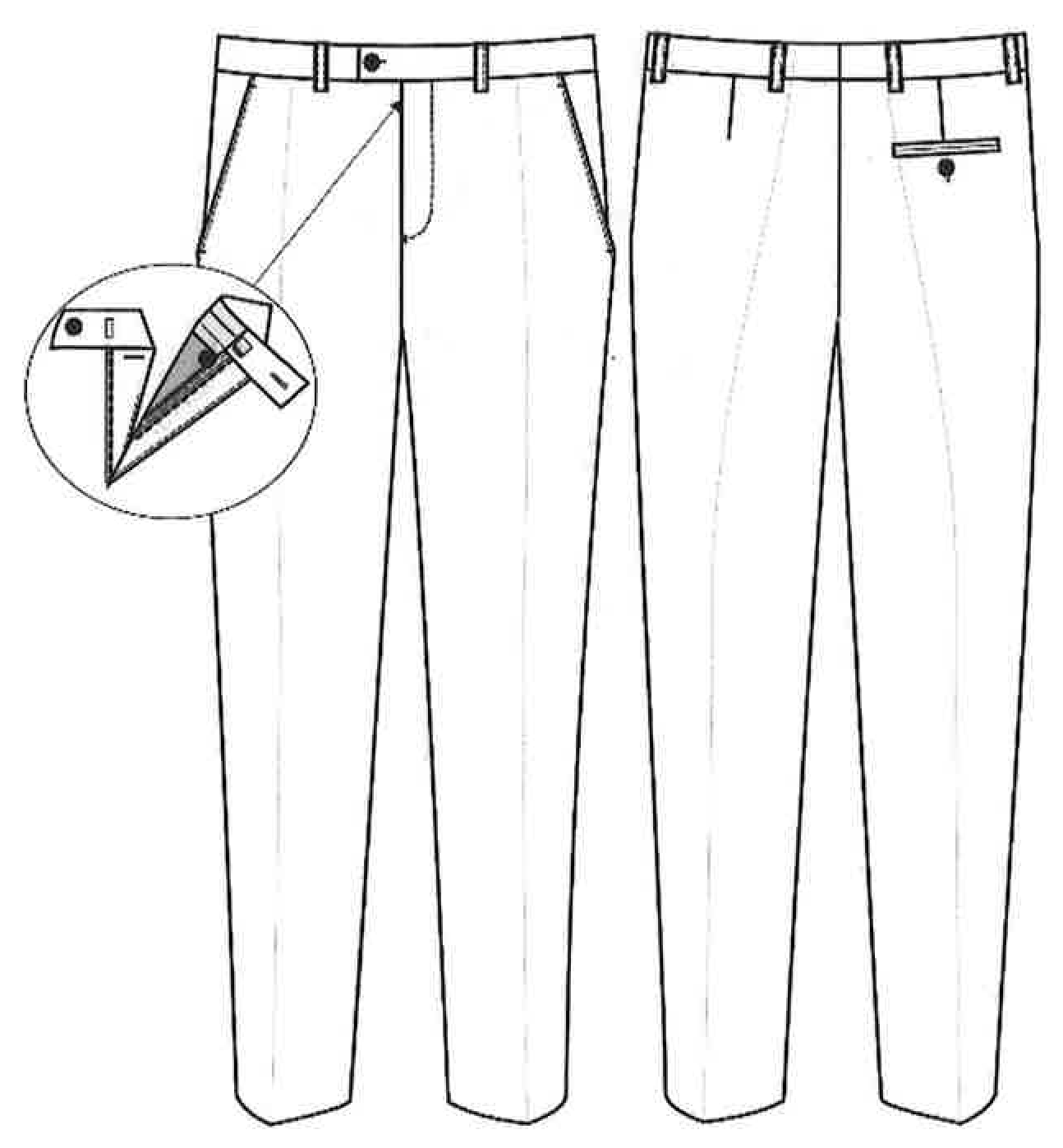 На передних половинках брюк расположены боковые подкройные карманы.