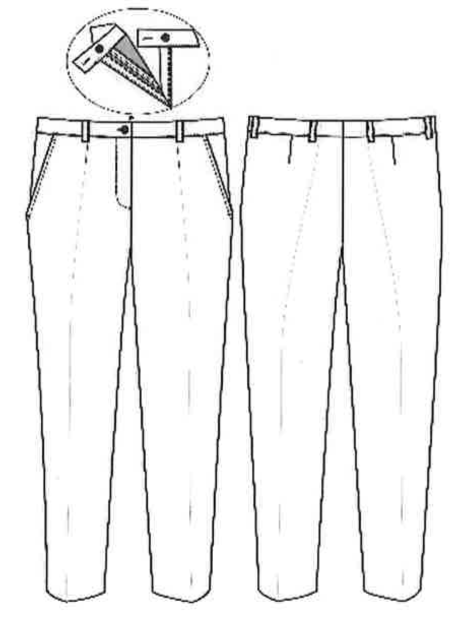 1.1.2. Брюки мужские (рисунок 2) прямого силуэта с притачным поясом. Пояс брюк на корсажной ленте, из двух частей с закрытыми концами. Левый конец пояса обтачной, закругленной формы.