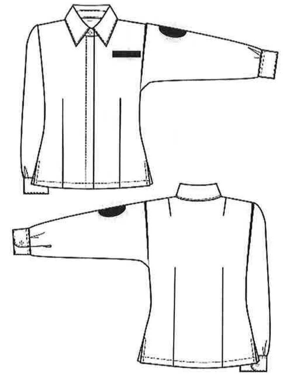 Спинка состоит из кокеток фигурной формы, переходящих в среднюю часть рукава, средней и нижней частей. Средняя часть с вертикальными складками для свободы движения.