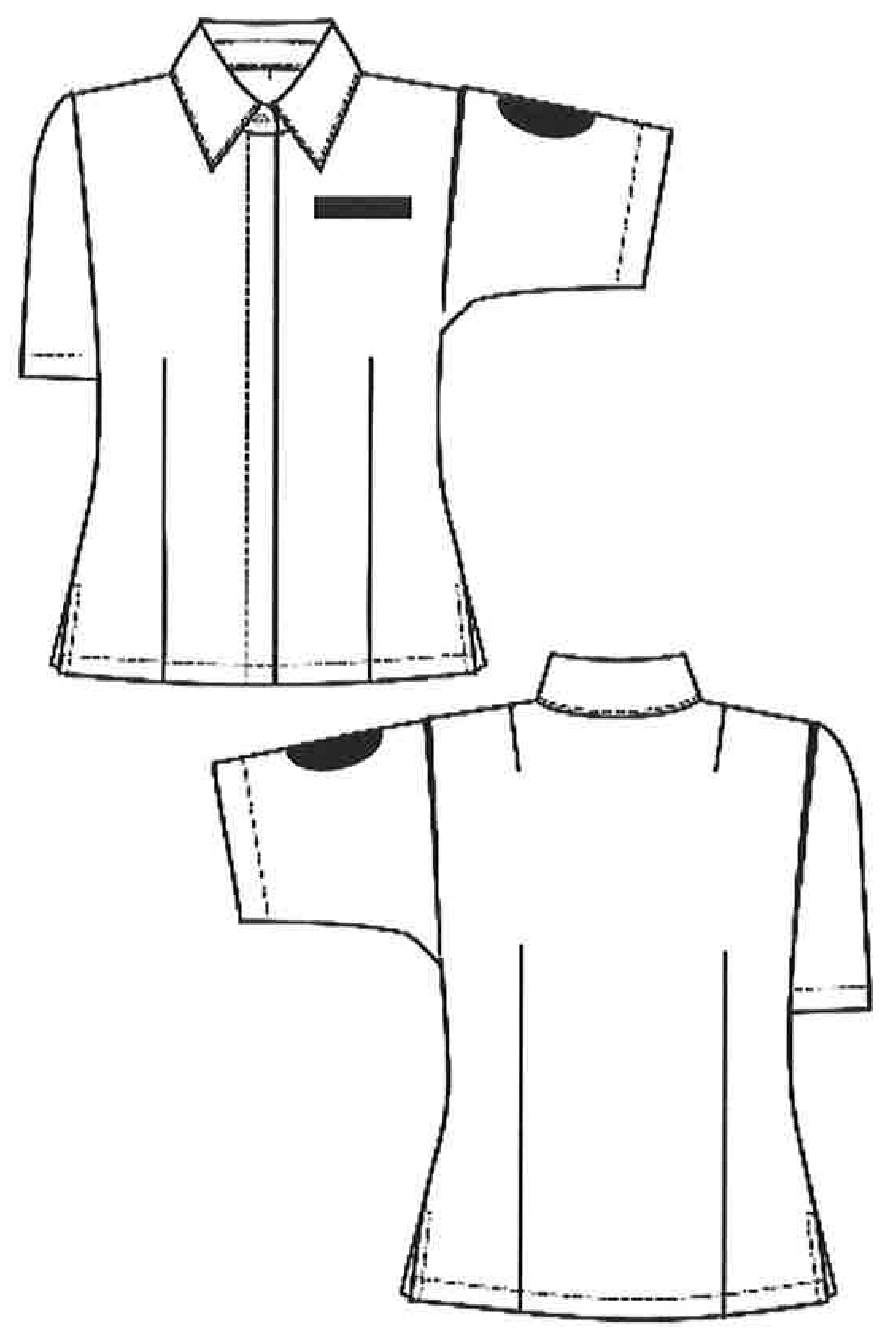 Полочка на цельнокроеной кокетке, центральная застежка на шесть пуговиц, воротник отложной, с острыми углами на отрезной стойке. Углы стойки прямые. Отделочная строчка по воротнику на 0,5 см от края.