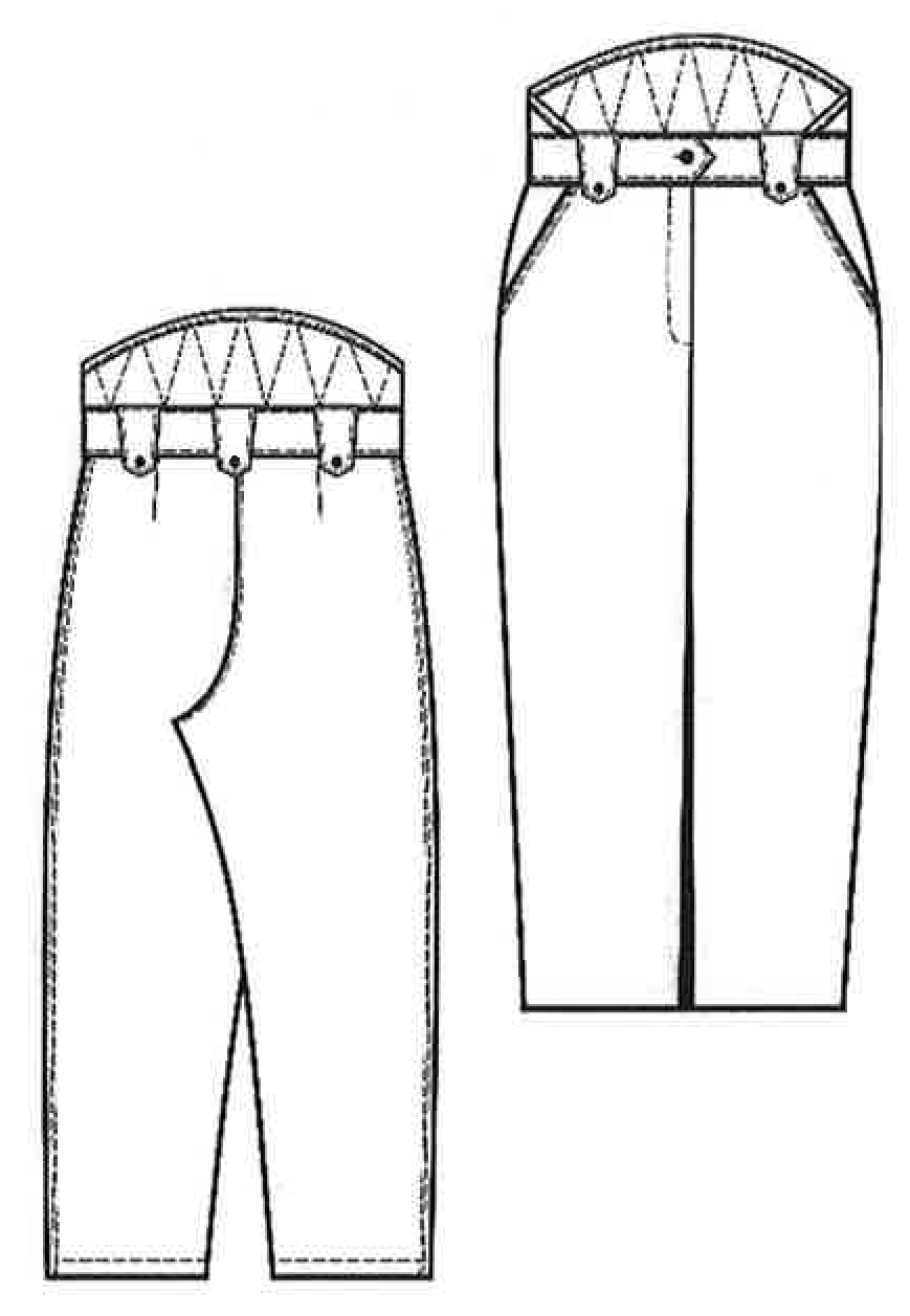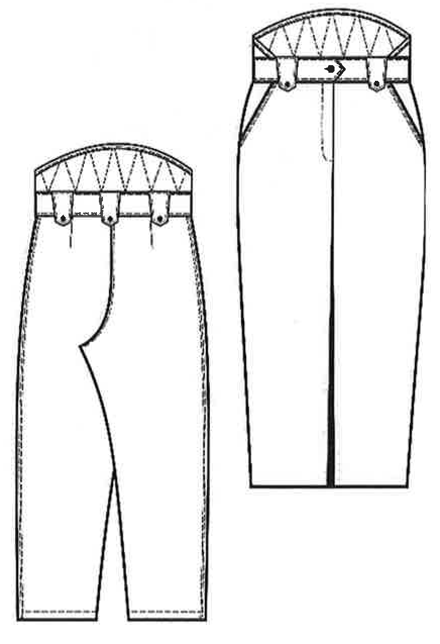 Пояс в области спины расширенный, в области боковых швов стягивается эластичной тесьмой. На пояс настрочены семь шлевок для ремня.
