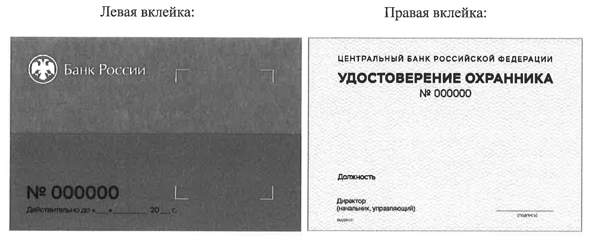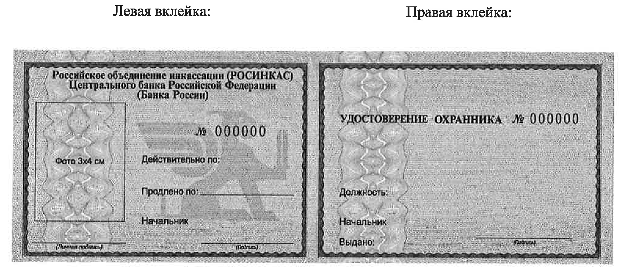 Вклейка к служебному удостоверению работника подразделения охраны Российского объединения инкассации состоит из двух частей: левой и правой. Обе части вклейки имеют по периметру контурные рамки. Размер каждой вклейки (левой или правой) - 100x70 мм.