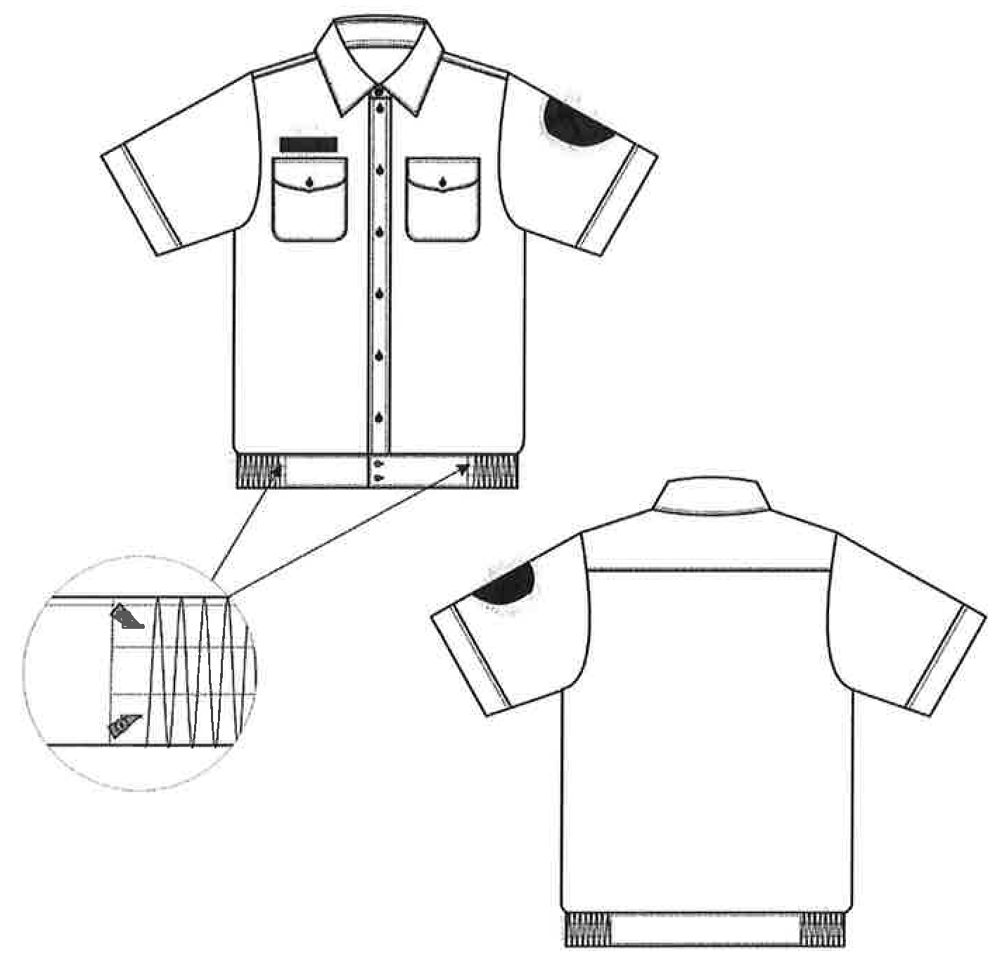 2.6. Футболка "поло" с коротким рукавом (рисунок 24), с отложным воротником, прямого силуэта, застегивающаяся на три обметанные петли и три пуговицы; верхняя петля расположена горизонтально, остальные - вертикально. Низ планки закреплен отделочной строчкой шириной 0,5-0,7 см. Рукава короткие, втачные с вязаными манжетами. Шов втачивания воротника обработан бейкой. Ширина бейки 0,8-1,0 см. Низ изделия обметан и закреплен двумя параллельными строчками. Ширина подгибки 2,0 см. Швы втачивания рукава и манжета закреплены отделочными строчками шириной 0,5-0,6 см. В левом боковом шве расположена маркировка. На левом рукаве расположен нарукавный знак (шеврон).